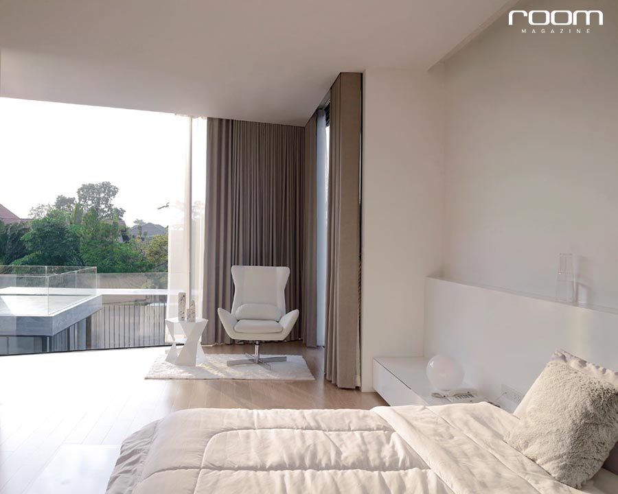 ห้องนอนแรกมีโครงสร้างที่ยื่นออกไปในส่วนของห้อง สถาปนิกได้ออกแบบให้มีเสาทรงกลมมาช่วยรับน้ำหนัก ซึ่งดีกว่าเสาสี่เหลี่ยมในแง่ของอันตรายที่อาจเกิดจากเหลี่ยมมุมแถมยังใช้พื้นที่น้อยกว่า จึงทำให้มองเห็นวิวภายนอกได้อย่างถนัดตา และโต๊ะทำงานเป็นเฟอร์นิเจอร์แบบบิลท์อิน ส่วนผนังและพื้นเน้นโทนสีอ่อนให้ความรู้สึกสบายตาเวลาทำงาน ส่วนห้องนอนชั้นสองตกแต่งด้วยโทนสีขาวสะอาดตา มุมที่เกิดจากการยื่นของอาคารถูกแทนที่ด้วยเก้าอี้นั่งตัวใหญ่ไว้สำหรับนั่งมองวิวสระว่ายน้ำได้อย่างเพลิดเพลิน