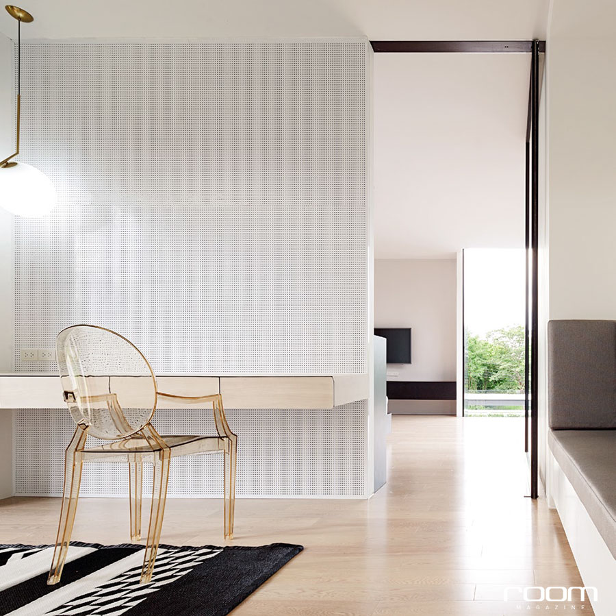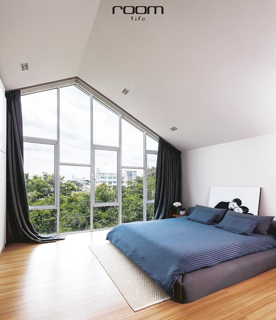 ตกแต่งคุมโทนด้วยสีสว่างนี้ยังต่อเนื่องไปถึงชั้น 4 ที่เป็นห้องนอน โดยออกแบบตู้เสื้อผ้าให้เรียบเนียนไปกับห้องใต้ฝ้าหลังคาจั่ว โดยไม่ทำให้ห้องคับแคบลงแต่อย่างใด ด้านข้างกรุกระจกใสตัดแสง จรดเพดานเพื่อรับแดดยามเช้าและเปิดช่องให้ลมไหลเวียนได้เป็นอย่างดี