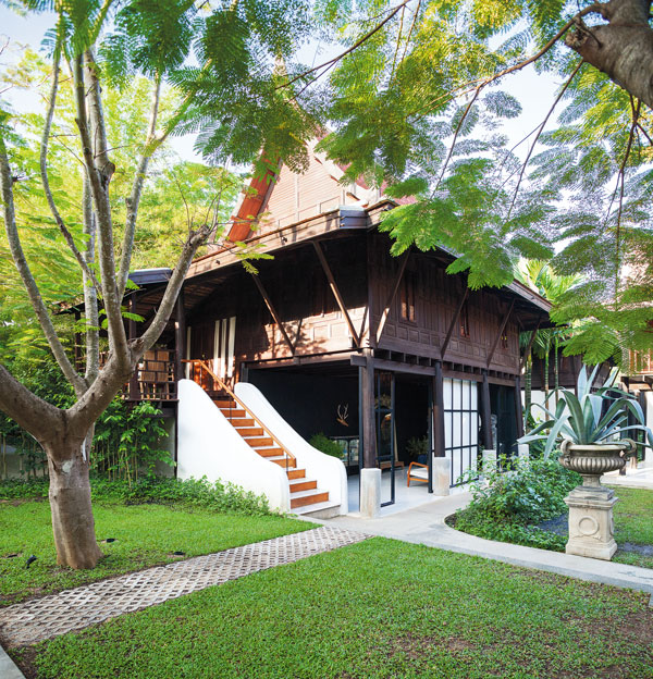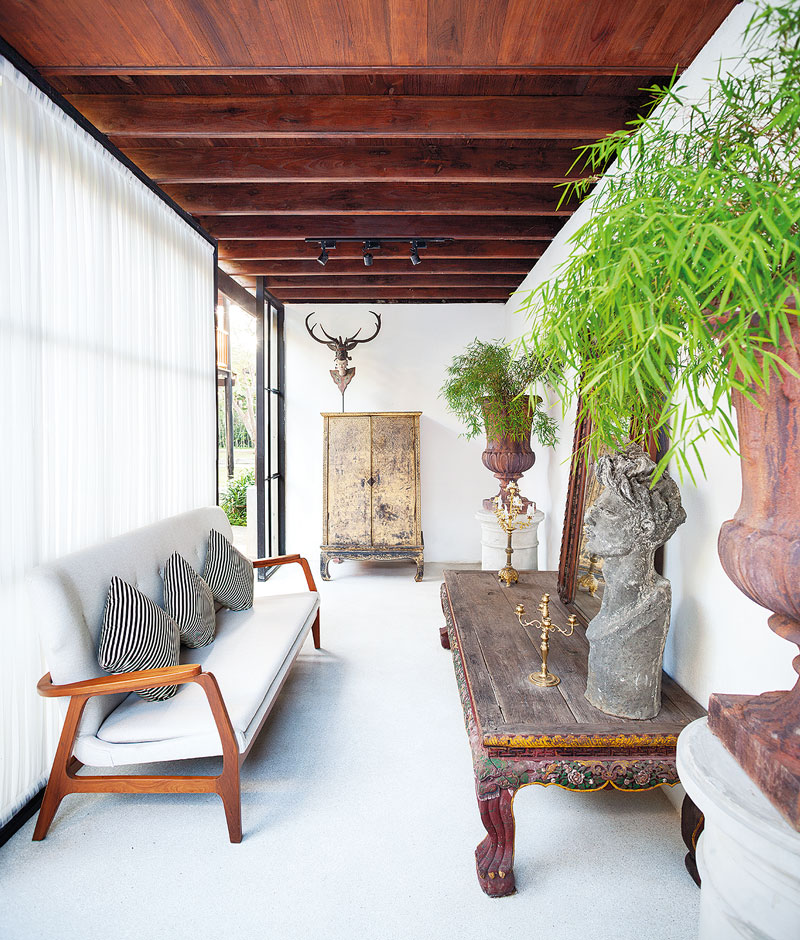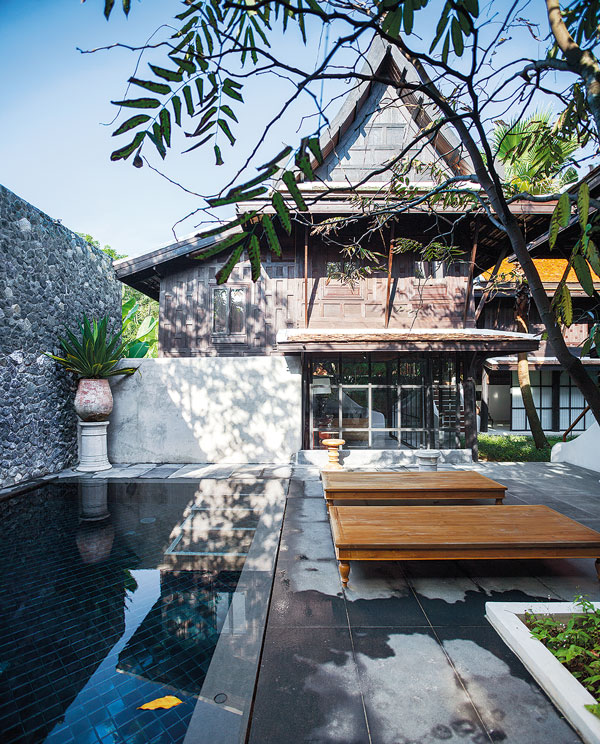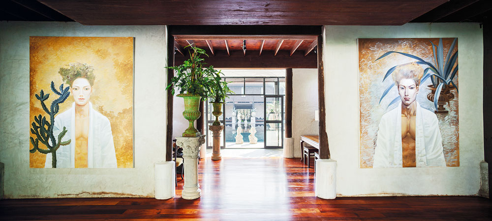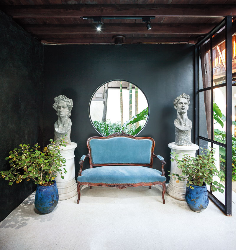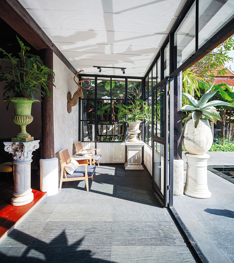 ยิ่งก้าวเท้าไปตามทางเดินก็ยิ่งตื่นตาตื่นใจราวกับท่องอยู่ในดินแดนแห่งศิลปะ ทั้งประติมากรรมปูนปั้นที่วางเด่นริมสระว่ายน้ำหรือกลมกลืนไปกับสวนไม้ใบสีเขียว และต้นไม้ใหญ่ที่สร้างความรู้สึกของกาลเวลาให้เรือนไทย อย่างหางนกยูง ราชาวดี ผสมเข้ากับกระบองเพชรรูปทรงเท่ รวมไปถึงเครื่องเรือนไทยและวินเทจ ซึ่งต้องอาศัยฝีมือและสายตาของผู้จัดวาง สร้างสรรค์เป็นองค์ประกอบที่เปี่ยมพลังและกระตุ้นแรงบันดาลใจชั้นเยี่ยม