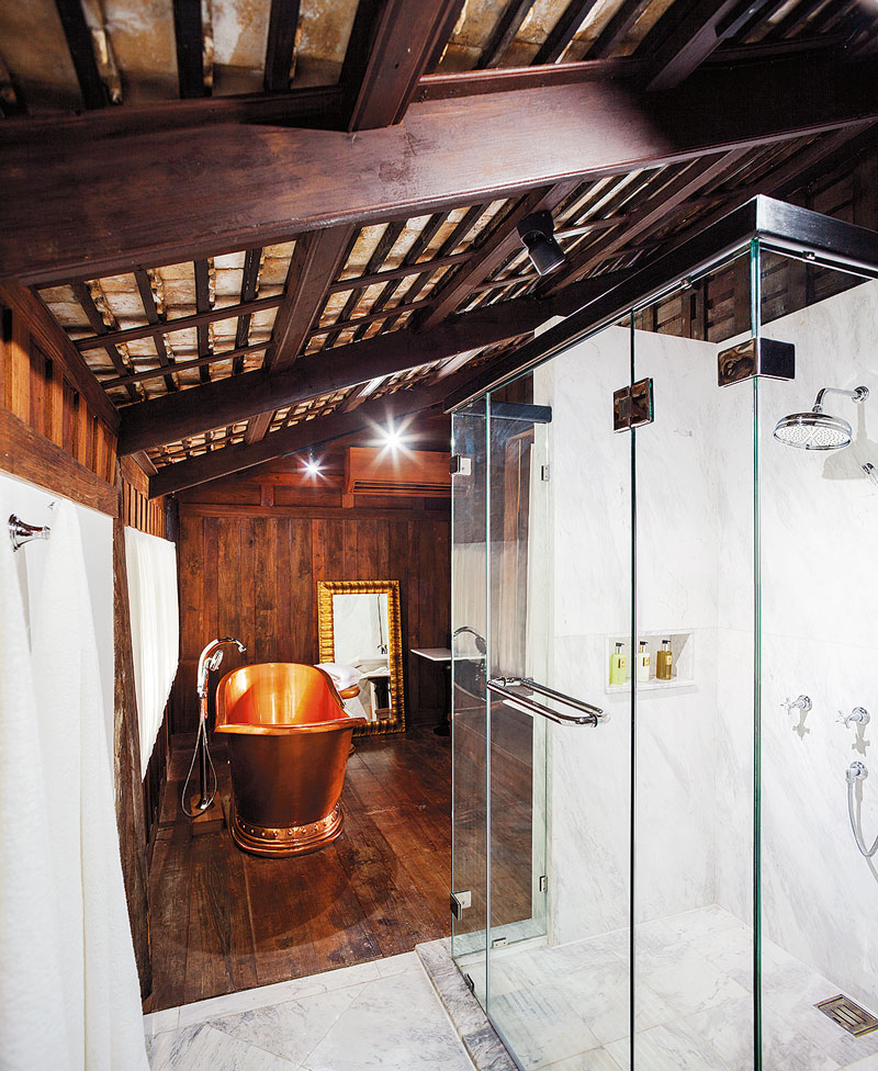 ภายในเรือนไทยเองก็มีการปรับประยุกต์หลายเรื่อง ทั้งการเพิ่มผนังแบบ Double Wall เพื่อเสริมฉนวนกันความร้อนไว้ตรงกลาง การทำกรอบหน้าต่างติดกระจกเพิ่ม การเติมฟังก์ชันใช้งานสมัยใหม่เพื่อให้อยู่สบาย และโดยเฉพาะการออกแบบห้องน้ำสไตล์โมเดิร์นที่สว่างสะอาดตาด้วยหินอ่อน เพิ่มสัมผัสของความหรูหราและทันสมัย เข้ามาไว้ภายในเรือนไทยได้อย่างเหนือระดับ