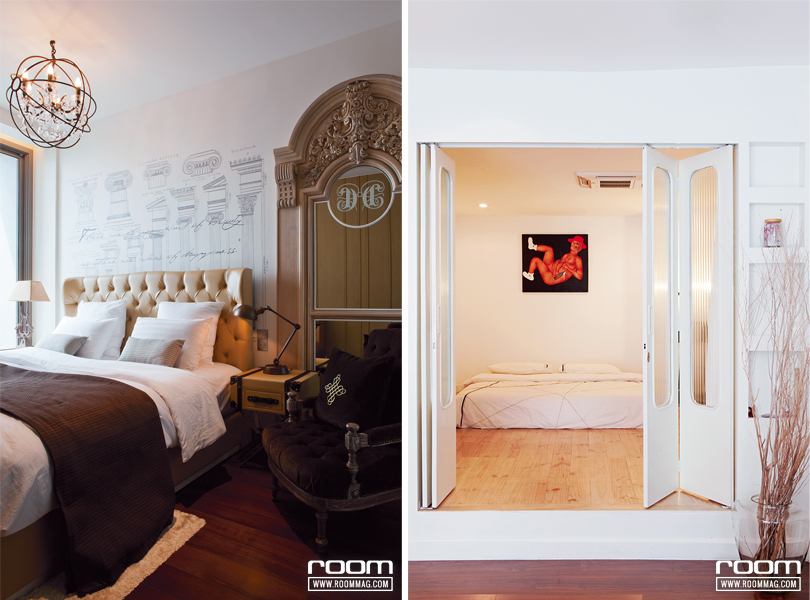 17 วางเตียงกลางห้องให้มีทางเดินโดยรอบเพื่อความโดดเด่น ทั้งยังช่วยปรับเส้นทางการสัญจรในห้องนอนให้ดีขึ้น อาจเพิ่มฟังก์ชันด้านหลังหัวเตียงให้เป็นโต๊ะทำงานหรือคอนโซลก็ได้