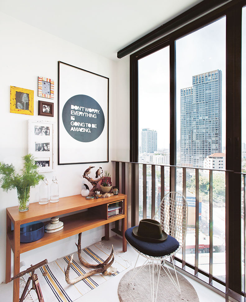 5. เพิ่มความเก๋ให้ผนังห้องมุมนั่งเล่นบริเวณระเบียงดูดึงดูดใจด้วยข้อความดีๆ และเรื่องราวหลากหลายในกรอบรูปน่ารักๆ