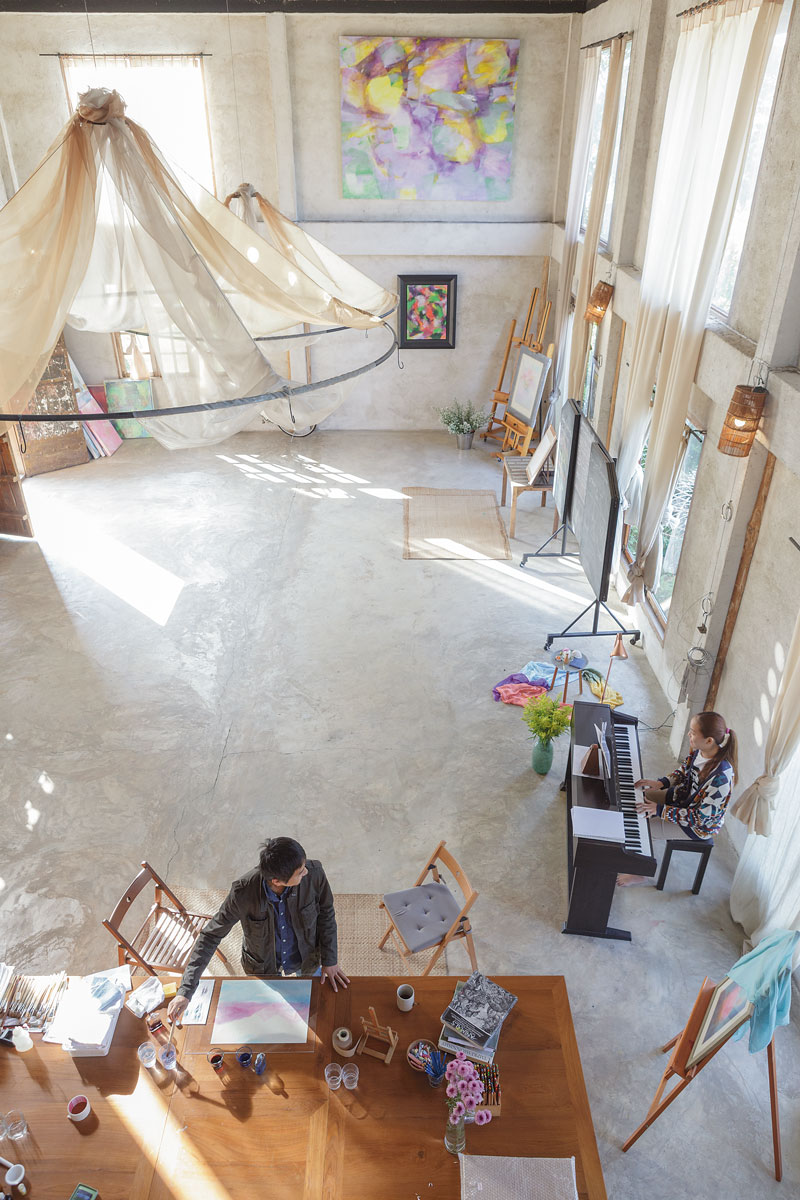 บ้านและสตูดิโอหลังนี้สร้างบนที่ดินซึ่งรายล้อมด้วยผืนนาและธรรมชาติอันสวยงามรอบดอยหลวงเชียงดาว โดดเด่นด้วยวัสดุก่อผิวอาคารที่มาจากดินเชียงดาวสีแดงอมน้ำตาลลักษณะของบ้านเป็นอาคารสองหลัง ที่เชื่อมกันด้วยระเบียงหน้าบ้านและสะพานไม้บนชั้นสองทั้งสองฝั่งทำหลังคาแบบเพิงหมาแหงนเอียง 45 องศามาบรรจบเข้าหากันดูเหมือนเป็นหลังคาแบบจั่วอันเดียวกัน ตรงกลางระหว่างอาคารทั้งสองหลังมีบ่อน้ำกั้นเพื่อให้ความเย็นแก่ตัวบ้านและสร้างช่องลมให้มีลมพัดเข้ามาภายในการตกแต่งดูเรียบง่ายเน้นประโยชน์ใช้สอยเฟอร์นิเจอร์ส่วนใหญ่ดัดแปลงจากไม้ในรูปทรงที่เป็นธรรมชาติรวมถึงของเก่าที่พบเห็นได้ในเมืองเชียงใหม่