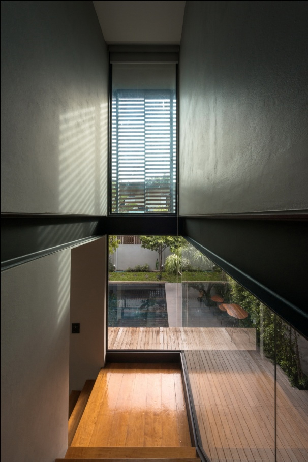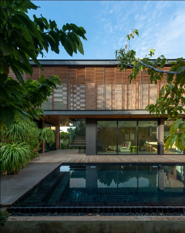 ด้วยแมกไม้ สายน้ำ และร่มเงาคือพระเอกของพื้นที่นั่งเล่นเลยทีเดียว ด้วยว่าต้นไม้และสระว่ายน้ำนั้นช่วยสร้างไอเย็นให้กับลมที่พัดเข้าสู่ตัวบ้าน อีกทั้งในทิศใต้ซึ่งจะมีแสงแดดยามบ่ายสาดส่อง ผู้ออกแบบก็ยังเลือกใช้ระแนงไม้มาปิดกั้นแดดอันเจิดจ้าเอาไว้ไม่ให้เข้าถึงตัวบ้าน ทั้งสองสิ่งจึงทำให้บ้านหลังนี้มีความสบายที่เหมาะกับภูมิอากาศเขตร้อน คือมีความชื้นที่พอดีจากลมเอื่อยๆ ยิ่งในเวลาที่แสงยามเย็นระเรื่อส่องเข้ามาในห้องนั่งเล่นแล้วนั้น สวยงามอย่าบอกใครเลยเชียว เป็นการทำความเข้าใจและใช้ข้อดีของภูมิอากาศบ้านเราอย่างที่หลายๆคนมักจะหนีไปใช้เครื่องปรับอากาศเสียอย่างนั้น เป็นที่น่าเสียดาย
