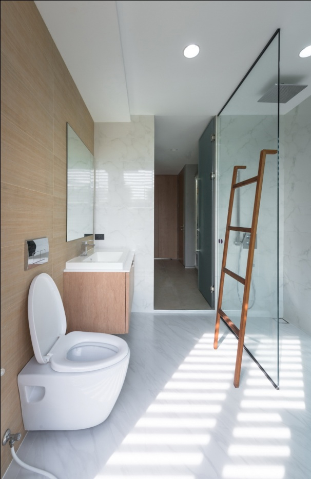 รูป 8 การใช้พื้นที่ในห้องน้ำอย่างชาญฉลาด สามารถใช้งานได้อย่างเต็มประสิทธิภาพโดยไม่รู้สึกถึงความเล็กของพื้นที่แต่อย่างใด โดยเน้นใช้สุขภัณฑ์แบบแขวนและใช้บานกระจกเพื่อสร้างความต่อเนื่องของพื้นที่ภายในห้องน้ำ