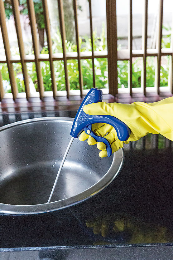 1. ถ้าการลงมือด้วยการถอดท่อดักกลิ่นออกมาล้างทำความสะอาดแล้วยังไม่ได้ผลอีก สายล้างท่อหรือ”งูเหล็ก”น่าจะเป็นผู้ช่วยที่ดีได้ เพียงสอดปลายสายเข้าไปในท่อระบายน้ำทิ้งอย่างช้า ๆ แล้วบีบด้ามจับที่มีลักษณะคล้ายปืนฉีดน้ำเพื่อให้พลาสติก (ไนล่อน) ตรงปลายกางออก (ดังรูป) เพื่อเกี่ยวหรือดึงสิ่งอุดตันให้หลุดออกไปจากท่อ