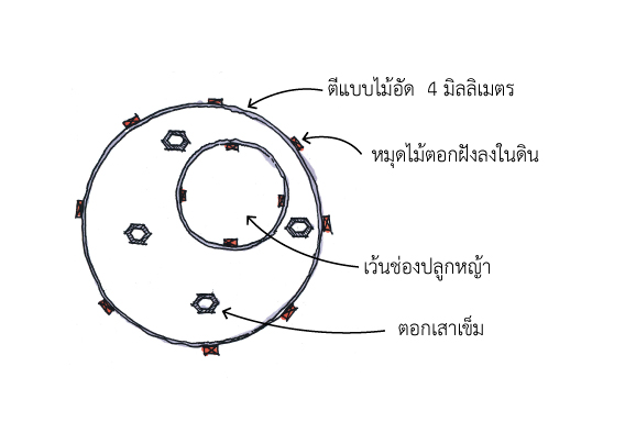 - กำหนดตำแหน่งลานวางกลมตามขนาดต่างๆ จากนั้นตอกเสาเข็มขนาด 1-2 เมตร แล้วแต่ขนาดของพื้นที่จะทำตามจุด (ตารางเมตรละ 1 ต้น)