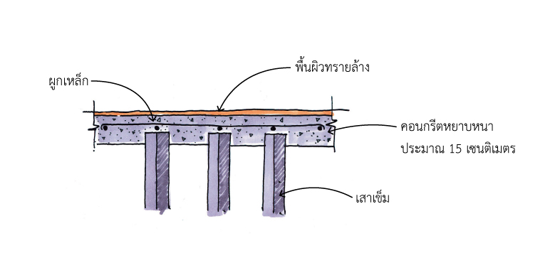 - ผูกเหล็ก เทคอนกรีตหยาบหนาประมาณ 15 เซนติเมตร จากนั้นทำพื้นผิวทรายล้างประมาณ 1.5 เซนติเมตร