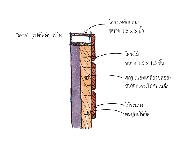 - ใช้แบบไม้อัดเป็นตัวกำหนดรูปร่างและขนาดตามต้องการ ยึดด้วยหมุดไม้ตอกฝังลงในดิน