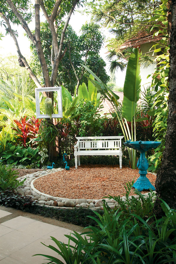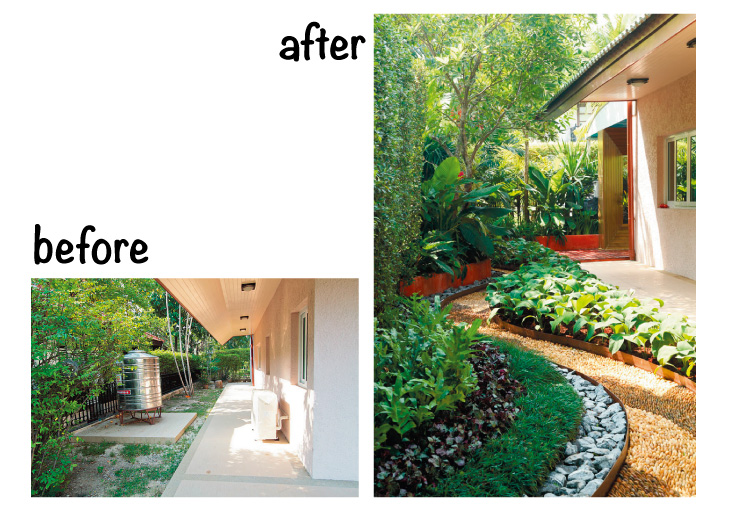 สภาพเดิมของบ้านมีต้นไม้ใหญ่ให้ร่มเงา และมีการบังเงาของตัวบ้าน ทำให้โซนนี้ร่มเกือบตลอดวัน จึงเลือกปลูกไม้ในร่ม ทำให้ได้บรรยากาศร่มรื่น มีอารมณ์แบบสวนป่า สร้างความน่าสนใจด้วยการทำขอบสำหรับปลูกต้นไม้และแนวทางเดินเป็นรูปทรงเรขาคณิต และเส้นโค้งหลายเส้นที่วางซ้อนกันดูสนุกสนาน เพิ่มชีวิตชีวาด้วยการวางของตกแต่งเก๋ๆ