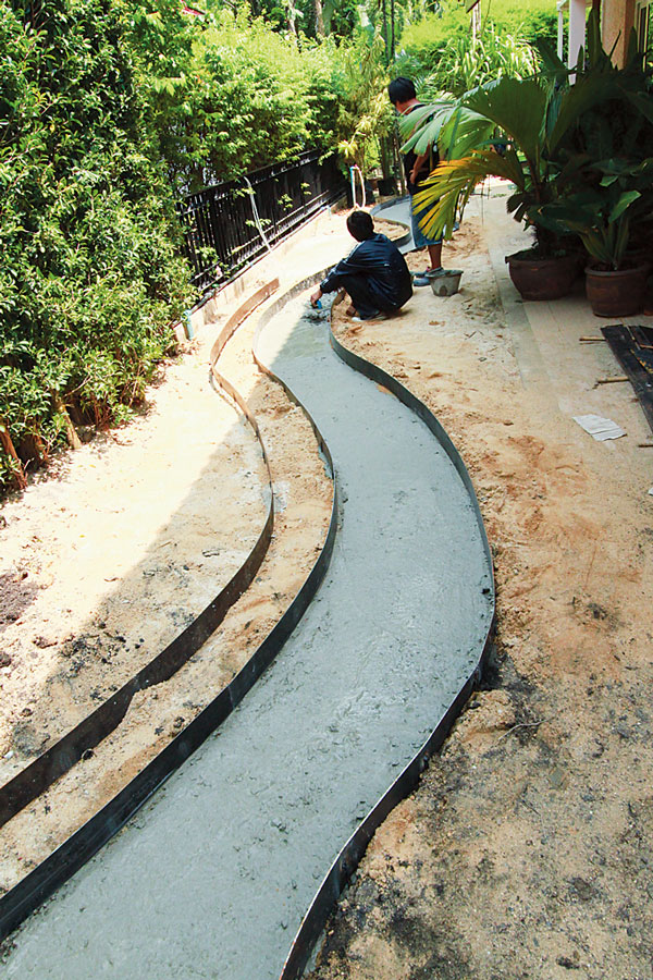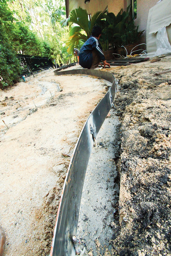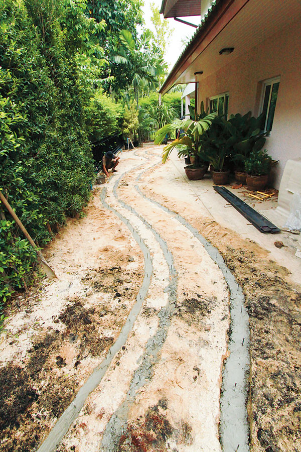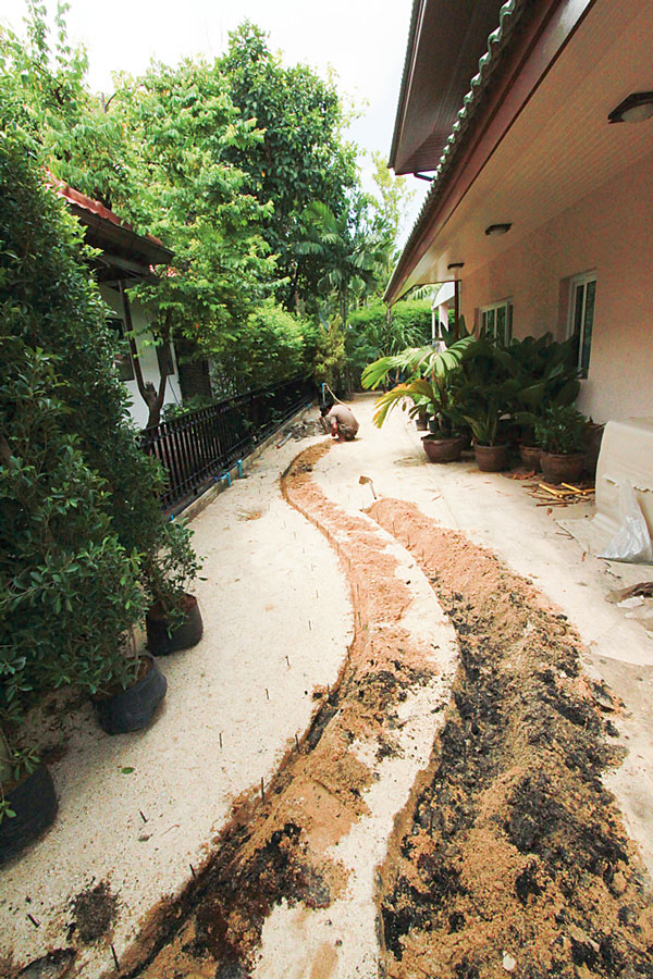 1. หลังจากปรับพื้นที่แล้ว จึงกำหนดแนวของขอบทางเดินที่จะทำ และขุดเพื่อเตรียมพื้นที่