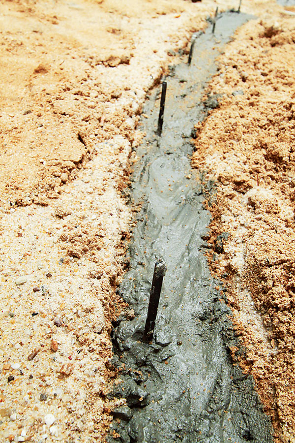 2. เสียบเหล็กเส้นยาวประมาณ 20-25 เซนติเมตร โดยให้มีเหล็กโผล่พ้นขอบสูงประมาณ 10 เซนติเมตร จากนั้นเทปูนโดยให้เหล็กโผล่ขึ้นมาจากปูนประมาณ 5 เซนติเมตร