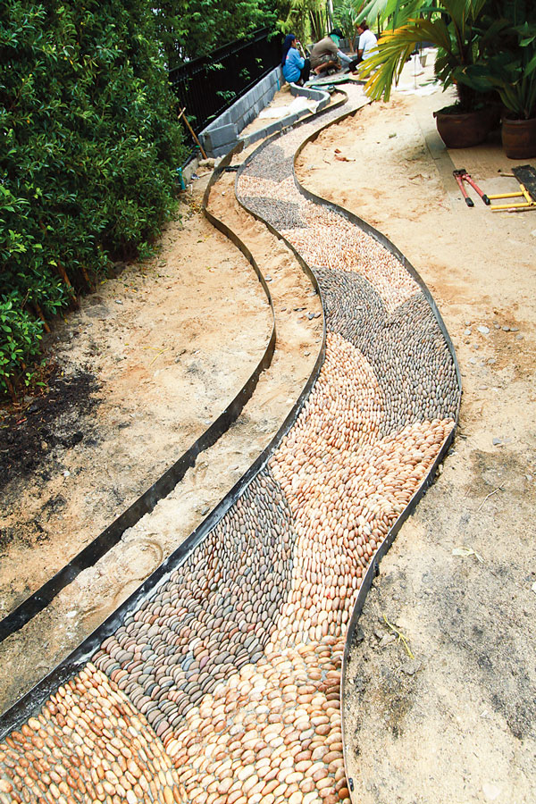 4. นำกรวดมากดในพื้นที่ขณะปูนยังไม่แห้ง เว้นตามสีสันและรูปทรงที่ต้องการ