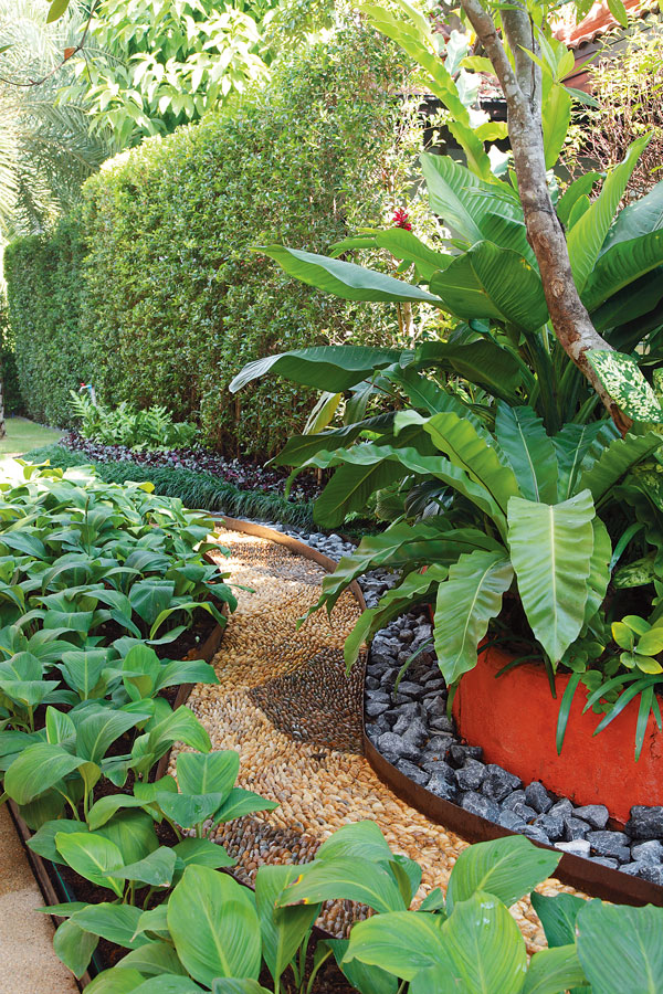 เป็นโซนพื้นที่ด้านข้างบ้านซึ่งเชื่อมต่อจากโซนแรกไปยังส่วนหลังบ้าน มีการใช้เส้นโค้งมาออกแบบแนวทางเดิน เพื่อสร้างความสนุกสนาน และเป็นเส้นนำสายตา สมมุติเราแทนผนังบ้านด้วยกำแพงต้นไม้และขอบกระบะต้นไม้เป็นเหมือนบัว เราจึงเห็นขอบกระบะ และการใช้แผ่นเหล็กกั้นส่วนต่างๆ สร้างบรรยากาศด้วยการใช้พรรณไม้เมืองร้อน เช่น เดหลี เฟินข้าหลวง เฟินฮาวาย และดาดตะกั่ว ขนานแนวทางเดินไปจนถึงด้านหลังซึ่งเป็นไฮไลต์หนึ่งของบ้าน คือ มีกรอบไม้ให้มองเห็นเหมือนรูปภาพจากธรรมชาติเมื่อมองออกมานอกตัวบ้าน