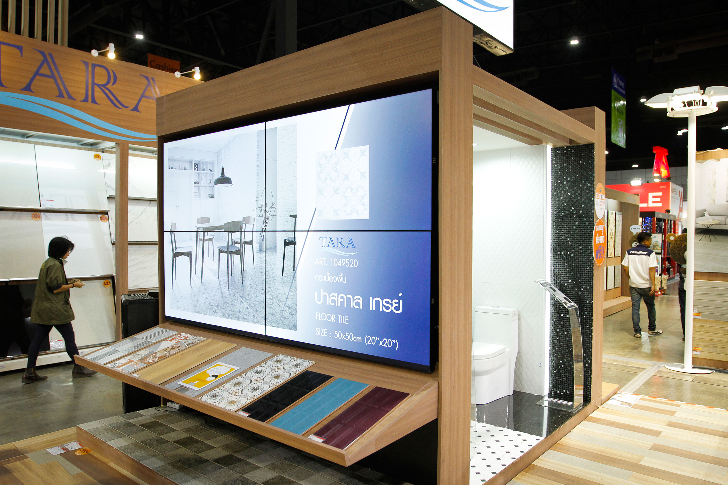 โซนกระเบื้องหรือสินค้าสำหรับห้องน้ำ ไม่ได้นำมาแค่ลวดลายใหม่ๆ แต่ยังให้แรงบันดาลใจในการนำไปใช้ด้วยการแสกนบาร์โค้ดตรงบริเวณกระเบื้องแต่ละชนิด ภาพตัวอย่างการติดตั้งจะโชว์ขึ้นบนโทรศัพท์ของคุณทันที นอกจากนี้ในบริเวณใกล้ๆ กัน TARA ยังนำสินค้ากระเบื้องยางแบบพรมมาจัดจำหน่าย เป็นอีกหนึ่งในวัสดุทางเลือกของคนที่กังวลเรื่องความปลอดภัยของเด็กและผู้สูงอายุภายในบ้านเพราะมีความยืดหยุ่นและนิ่มสบายเท้ามากกว่ากระเบื้องธรรมดาทั่วไป ที่มาพร้อมกับคุณสมบัติ ติดตั้งง่ายเพียงแค่ลอกเทปกาวด้านหลังออกแล้วแปะลงบนพื้น ให้ความนุ่มสบายเท้าพร้อมทั้งเก็บเสียงได้ดีไม่ก่อให้เกิดความรำคาญเวลาเดิน รวมไปถึงมีความยืดหยุ่น ทนทานรอยขีดข่วนและมีอายุการใช้งานยาวนานกว่า 10 ปี ซึ่งจะมีขายภายในงาน HomePro EXPO และ โฮมโปรอีก 22 สาขาเพียงเท่านั้นครับ