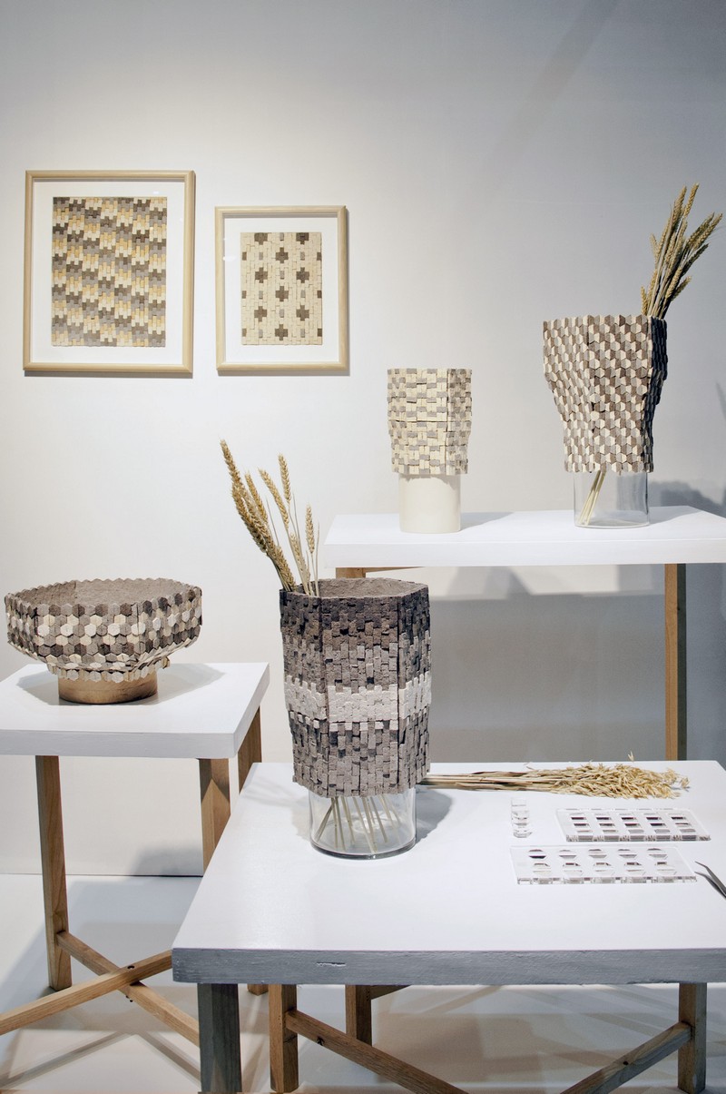 เทคนิค หล่อขึ้นรูปทรง 3มิติ โดยใช้แม่พิมพ์ของงานเซรามิคมาประยุกต์ใช้กับการขึ้นรูปฟางข้าวให้เป็นกระเบื้อง mosaic ผ่านการทำสีดำเฉดต่างๆจากถ่าน