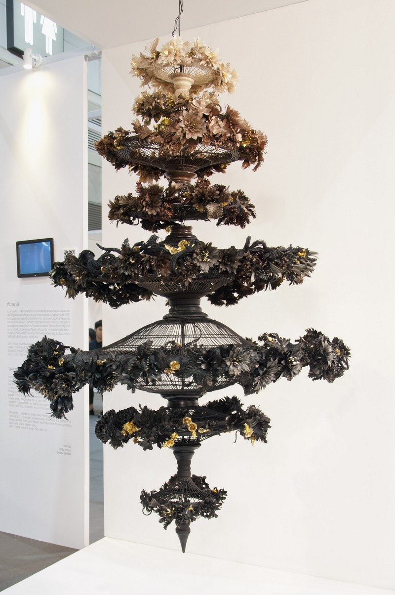 เทคนิค การจักสานไม้ไผ่ประกอบกับการจารแผ่นทองเป็นลวดลายและพับงอเป็นดอกไม้ การปั้นขึ้นรูปเครื่องปั้นดินเผา ด้วยมือและการเผาแบบรมดำ