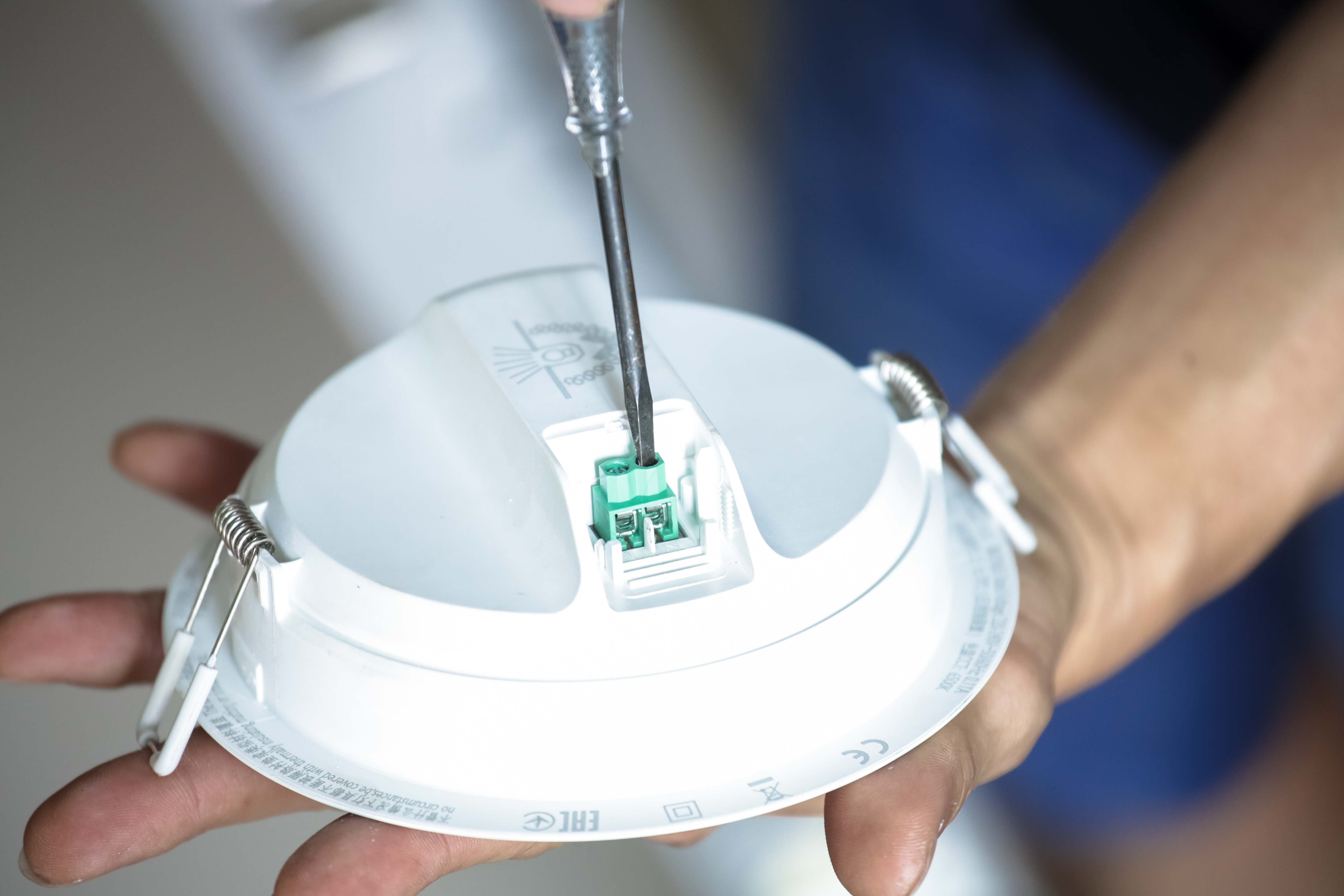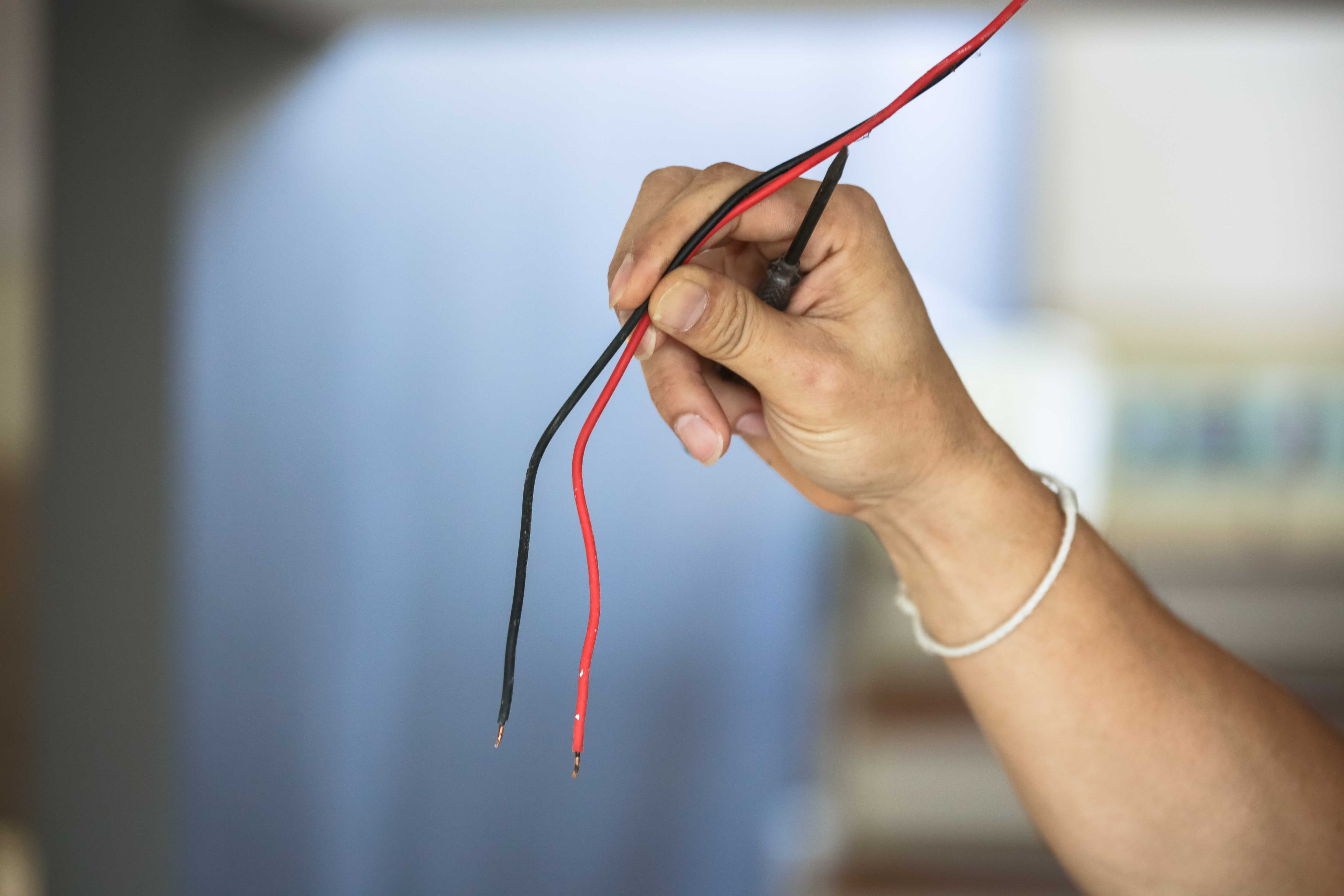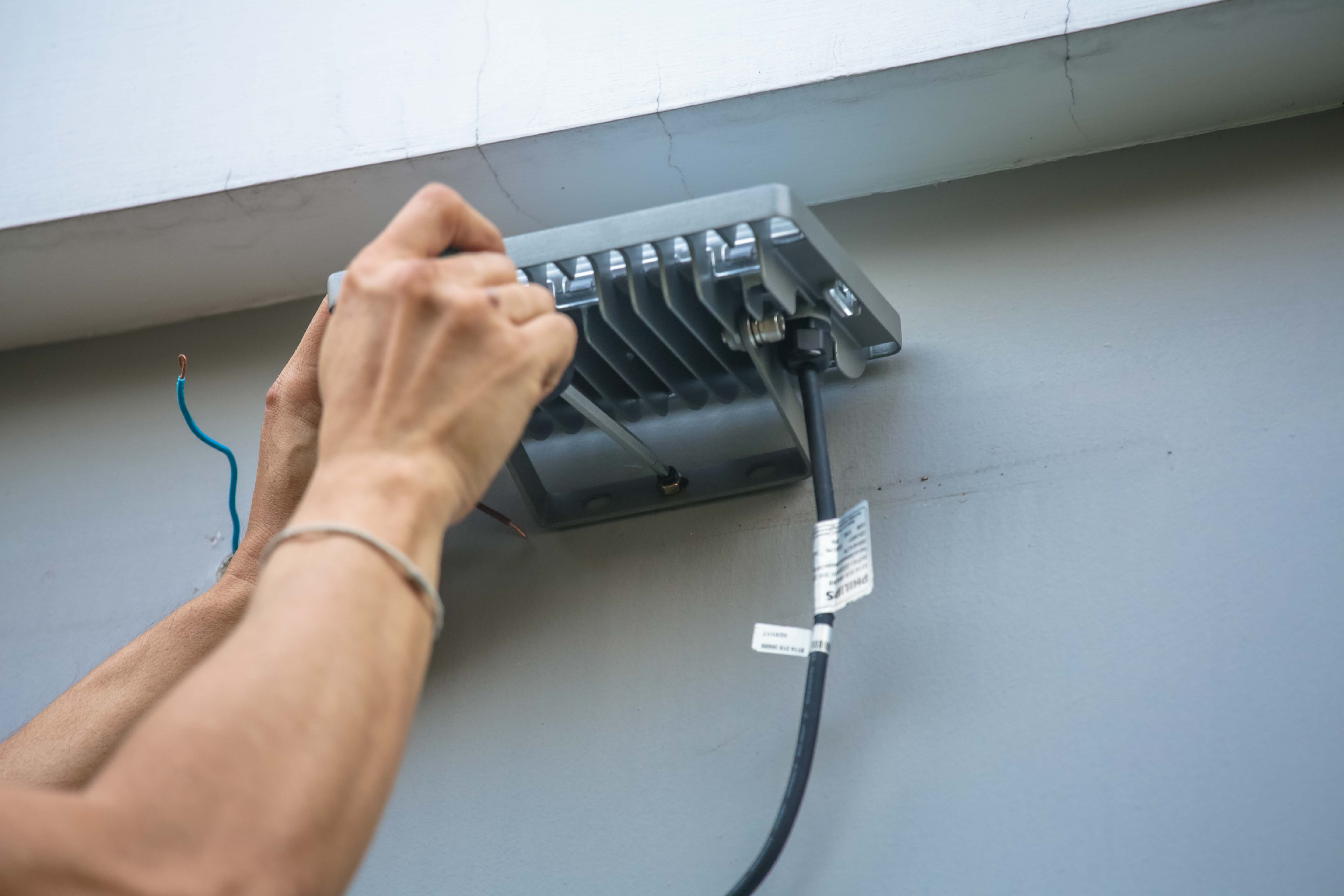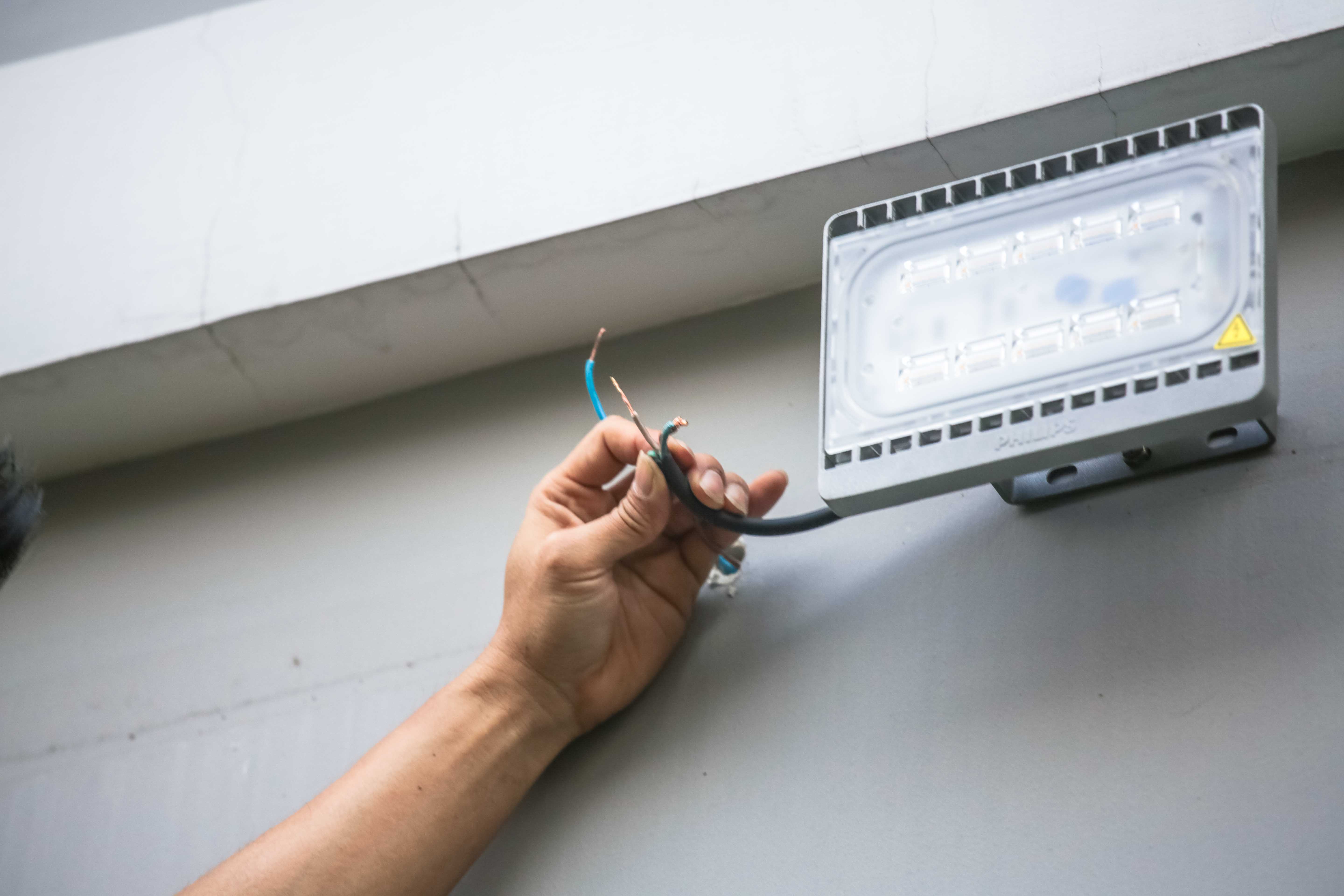 3. ใช้คัตเตอร์ปอกฉนวนสายไฟแล้วเชื่อมสาย N กับ L เข้ากับสายเมนของบ้าน โดยเว้นสายกราวน์ไว้หากติดตั้งบนที่สูง พันด้วยเทปพันสายไฟเพื่อป้องกันอันตรายจาการโดนน้ำฝนหรือแดดซ้ำอีกครั้ง