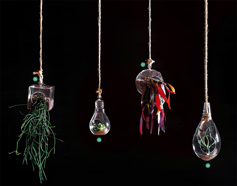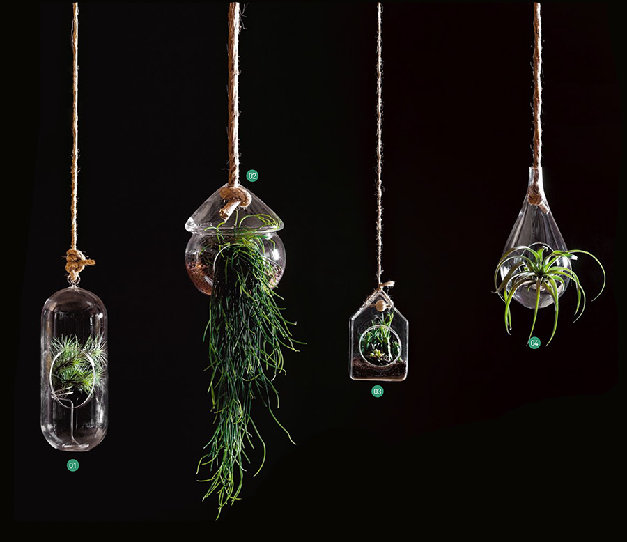 กระถางแขวนแก้วเป็นภาชนะปลูกที่มีความโปร่งใส จึงสามารถนำมาตกแต่งสเปซในแนวดิ่งได้อย่างดี โดยไม่ทำให้พื้นที่อึดอัดหรือรบกวนบรรยากาศการตกแต่งรอบ ๆที่สำคัญยังช่วยโชว์รูปทรงของต้นไม้ได้เต็มที่ ส่วนพรรณไม้ที่นำมาปลูกควรเลือกให้มีขนาดเหมาะสมกับกระถาง ดูแลรักษาง่าย เช่น ไม้จำพวกรากอากาศหรือไม้อวบน้ำ