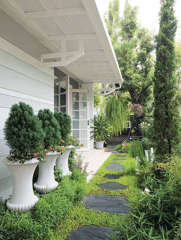 จัดวางต้นไม้บริเวณหน้าบ้านขนาบแผ่นทางเดินหินกาบรูปทรงฟรีฟอร์มขนาดใหญ่ให้มีความสูง – ต่ำไล่ระดับลดหลั่นกันอย่างลงตัว ทำให้สวนดูมีมิติเป็นธรรมชาติต้นไม้ที่ไม่สูงมากช่วยเปิดมุมมองหน้าบ้านให้เชื่อมโยงกับสวนของโครงการฝั่งตรงข้ามได้เป็นอย่างดี และในบริเวณนี้เราจะได้ยินเสียงน้ำพุในกระถางปูนเปลือยที่ตั้งตรงกับประตูบานเลื่อนของห้องรับแขก ซึ่งทางเจ้าของบ้านได้ปรับปรุงใหม่ให้สามารถเปิดรับมุมมองและฟังเสียงธรรมชาติได้มากยิ่งขึ้น
