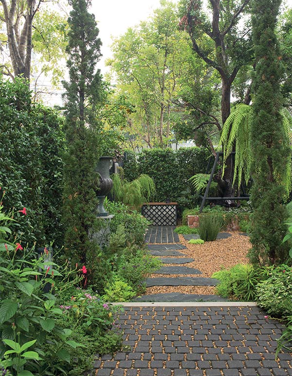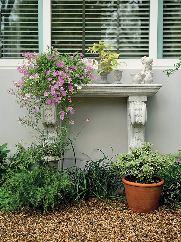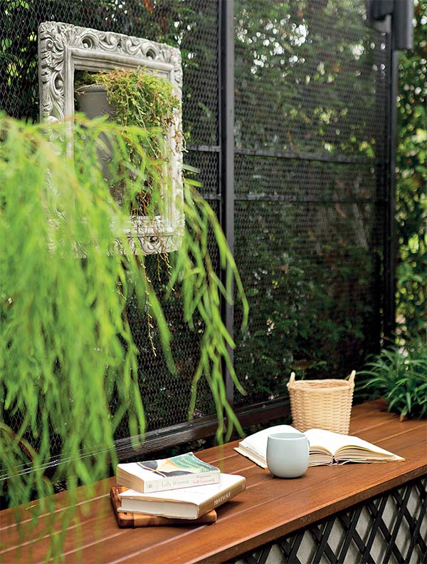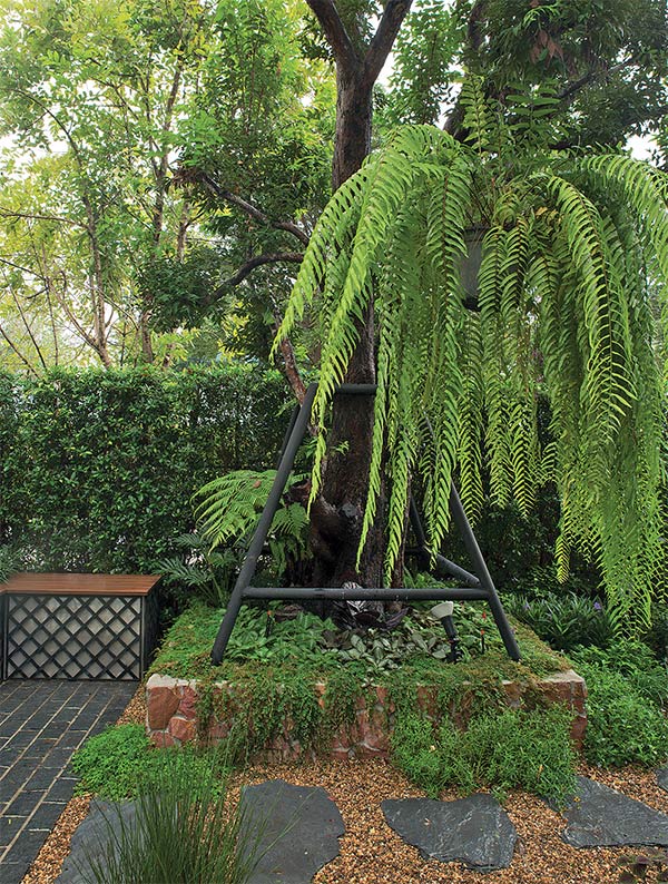 เมื่อเดินผ่านกระถางเฟินต้นใหญ่ที่แขวนอยู่ตรงปลายของทางเดินหน้าบ้านแล้ว ก็เสมือนเป็นการเปิดม่านเข้าสู่พื้นที่สวนที่ซ่อนอยู่ภายใน กระถางต้นไม้นี้ถูกแขวนอยู่กับต้นเสม็ดแดงต้นใหญ่ที่ทางเจ้าของบ้านเลือกมาเพิ่มความน่าสนใจให้แก่สวนรวมถึงใช้บังมุมมองของหม้อแปลงไฟฟ้าหน้าบ้าน ส่วนพื้นที่ใต้ต้นไม้ คุณศักดิ์ได้กั้นขอบตั้งแต่ต้นไม้จนถึงไม้ค้ำยันให้กลายเป็นกระถางต้นไม้ขนาดใหญ่ โดยปลูกไม้พุ่มและไม้คลุมดินแทรกจนเต็มพื้นที่ ถัดไปยังมีมุมม้านั่งรูปตัวแอล (L) ที่รับกันดีกับมุมของบ้าน เป็นการสร้างมุมพักผ่อนส่วนตัวที่ทางเจ้าของบ้านมักใช้เป็นมุมอ่านหนังสือและมุมรับแขกนอกบ้าน