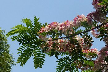 กัลปพฤกษ์ ไม้ต้นผลัดใบ ทรงพุ่มกลม เปลือกต้นสีเทา ใบประกอบแบบขนนกปลายคู่ เรียงสลับ ปลายใบมนหรือมีติ่งสั้น ดอกเป็นช่อกระจะออกตามกิ่ง ยาว 5 – 10 เซนติเมตร มีกลีบดอก 5 กลีบ สีชมพู และเปลี่ยนเป็นสีขาวเมื่อใกล้โรย เกสรเพศผู้สีเหลือง ออกดอกเดือนกุมภาพันธ์ – เมษายน ผลฝักกลม ยาว 15 – 30 เซนติเมตร เมื่อแก่สีดำ เนื้อในสีขาว ชอบแสงแดดตลอดวัน