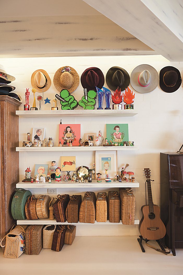 คุณลุลาเล่าให้เราฟังขณะพาไปชมยังส่วนต่างๆ ของบ้านในมุมครัวตกแต่งอย่างเรียบง่าย โดยได้สีสันสดใสจากบรรดาถ้วยจานชามเซรามิก รวมไปถึงเครื่องครัวอื่นๆ ซึ่งคุณลุลาเริ่มสะสมจากการเดินทางไปท่องเที่ยวต่างประเทศ ทั้งเยอรมนี ญี่ปุ่น และไต้หวัน ในช่วง 2 – 3 ปี หลังจากที่คิดทำบ้าน ส่วนโต๊ะไม้ตรงกลางสั่งทำพิเศษให้ขนาดพอดีกับพื้นที่ตรงกลางของห้อง เป็นไอส์แลนด์สำหรับเตรียมอาหารและเก็บเครื่องครัวต่างๆ ต่อกับโต๊ะรับประทานอาหารอีกตัว ถัดไปก่อนถึงระเบียงเป็นมุมรับแขกและนั่งพักผ่อนดูโทรทัศน์ ซึ่งรายล้อมด้วยบรรดาของสะสมที่โปรดปราน ตั้งแต่หมวก กระเป๋าหวาย ตุ๊กตาตัวเล็กกระจุกกระจิก รวมถึงมุมเปียโนและเครื่องดนตรีชนิดต่างๆ ด้วย คุณลุลามักใช้นั่งเล่นแต่งเพลงในบางเวลา ทั้งหมดนี้ช่วยเติมความมีชีวิตให้คอนโดมีเนียมแห่งนี้มีความเป็นบ้านที่อบอุ่นยิ่งขึ้น