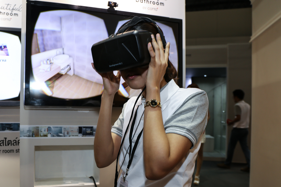 ก่อนจะไปสู่โซนน่าสนใจอื่น เราแอบสะดุดตากับความน่าสนใจของเทคโนโลยีใหม่ที่พาคุณไปเยี่ยมชมห้องน้ำแบบเสมือนจริงผ่านแว่น Oculus Rift ที่จะช่วยให้ผู้ร่วมงานทุกท่านได้เข้าถึงประสบการณ์ใหม่ของการเยี่ยมชมห้องน้ำหลากรูปแบบหลายสไตล์ เพื่อเข้าถึงไอเดีย ฟังก์ชั่นการใช้งาน และรายละเอียดต่างๆในห้องน้ำแบบ 360 องศา บอกได้คำเดียวว่าน่าทึ่งค่ะ