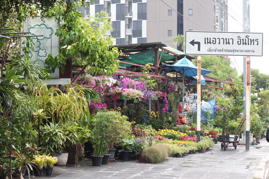 ริมถนนเลียบทางด่วนรามอินทราอาจมีร้านค้าต้นไม้ไม่มากนัก แต่ถ้าลองเดินทะลุเข้าไปในซอยก็จะพบร้านขายต้นไม้อีกมากมาย ตลาดนี้อาจจอดรถริมถนนใหญ่ไม่ได้ในบางเวลา แต่คุณสามารถขับรถเข้าไปในซอยแล้วจอดหน้าร้านที่จะซื้อได้เลย ที่นี่ยังมีความพิเศษตรงที่มีเลนจักรยานด้วย จึงสามารถปั่นจักรยานไปพร้อมกับเลือกชมต้นไม้ได้ตลอดทาง ตลาดนี้มีต้นไม้ให้เลือกหลากหลาย เน้นไปทางไม้ดอก ไม้ประดับ ไม้แขวน รวมถึงเฟอร์นิเจอร์ไม้และของแต่งสวน เปิดทุกวัน เวลา 8.00 น. – 17.00 น.