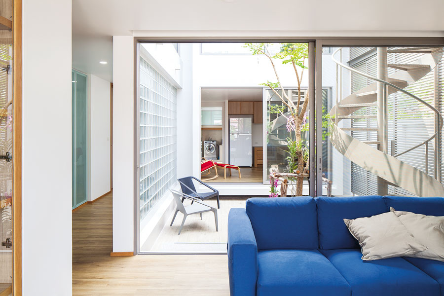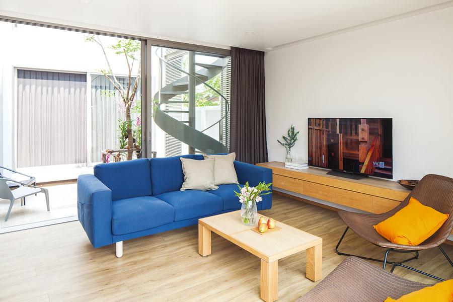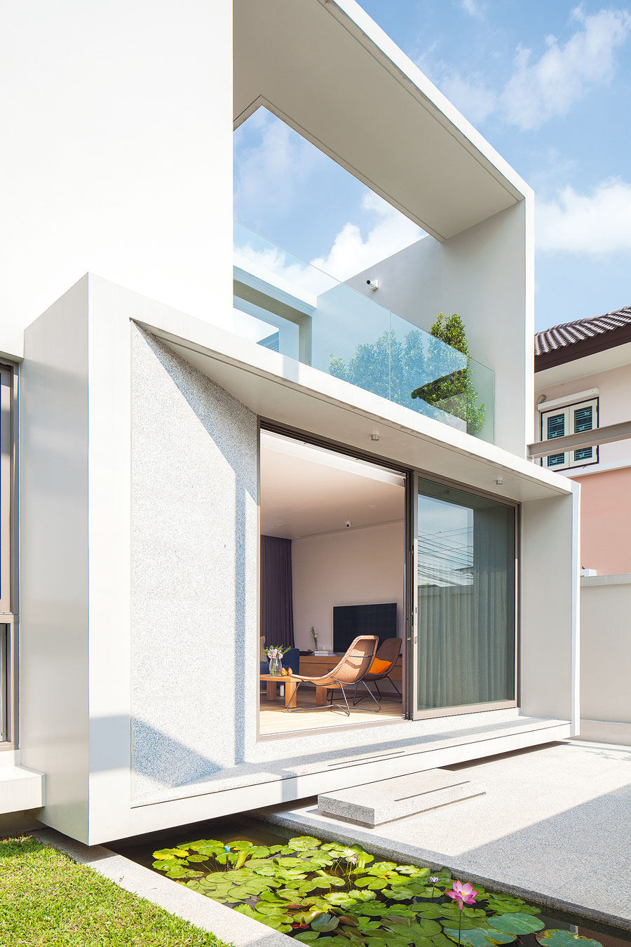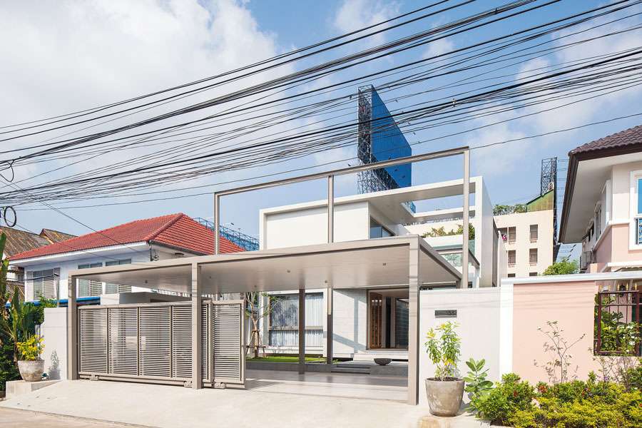 “รูปทรงของบ้านก็มาจากฟังก์ชันที่เรากำหนดไว้ตามแบบ Form Follows Function คือการใช้สอยภายในเป็นอย่างไร รูปแบบก็จะตามไปอย่างนั้น” คุณสมพร แสงเกิด สถาปนิกของบ้านเล่าเสริม “เริ่มจากพื้นที่โรงจอดรถด้านหน้าที่จำเป็นต้องมี แล้วเข้ามาสู่ห้องต่างๆ บริเวณชั้นล่าง พอนำมาเรียงกันก็เกิดเป็นฟอร์มขึ้นมา ประกอบต่อขึ้นเป็นห้องนอนชั้นบน กลายเป็นโครงสร้างและหน้าตาของบ้าน ซึ่งเราเน้นให้ดูเรียบง่ายและเป็นไปตามสัจธรรมของสิ่งนั้น ไม่อยากต้องเปลี่ยนไปตามแฟชั่น บ้านก็เลยออกมาเป็นเหมือนก้อนสี่เหลี่ยมที่คว้านตรงกลางเข้าไป เพื่อเปิดเป็นช่องธรรมชาติเอาไว้ให้คนในบ้านได้ชื่นชม”