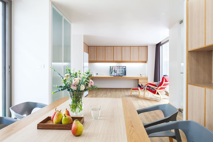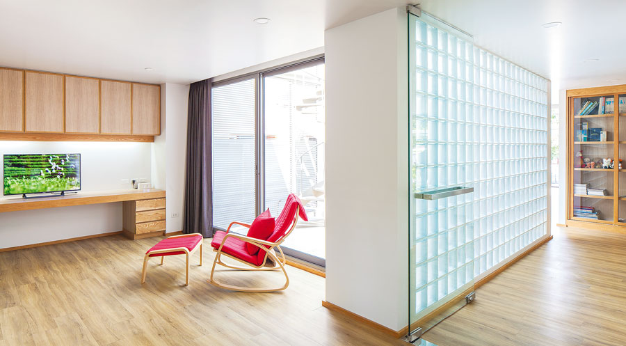 “เพราะว่าคนที่เป็นหลักของบ้านก็คือคุณแม่ ซึ่งอยู่บ้านมากกว่าใครๆ เราจึงต้องออกแบบเพื่อเอื้อต่อความสะดวกในการใช้งานของคุณแม่ ซึ่งมักวนเวียนอยู่ในครัว ห้องอาหาร และห้องนอนชั้นล่าง พร้อมกับเน้นให้เป็นบ้านที่ดูแลรักษาเองได้ง่ายที่สุด ไม่มีซอกไม่มีหลืบ ผู้สูงวัยก็สามารถใช้งานเองได้คล่องในทุกมุม” คุณสุพจน์ แสงเกิด น้องชายคนเล็ก เล่าถึงจุดเริ่มต้นของบ้านให้ฟัง