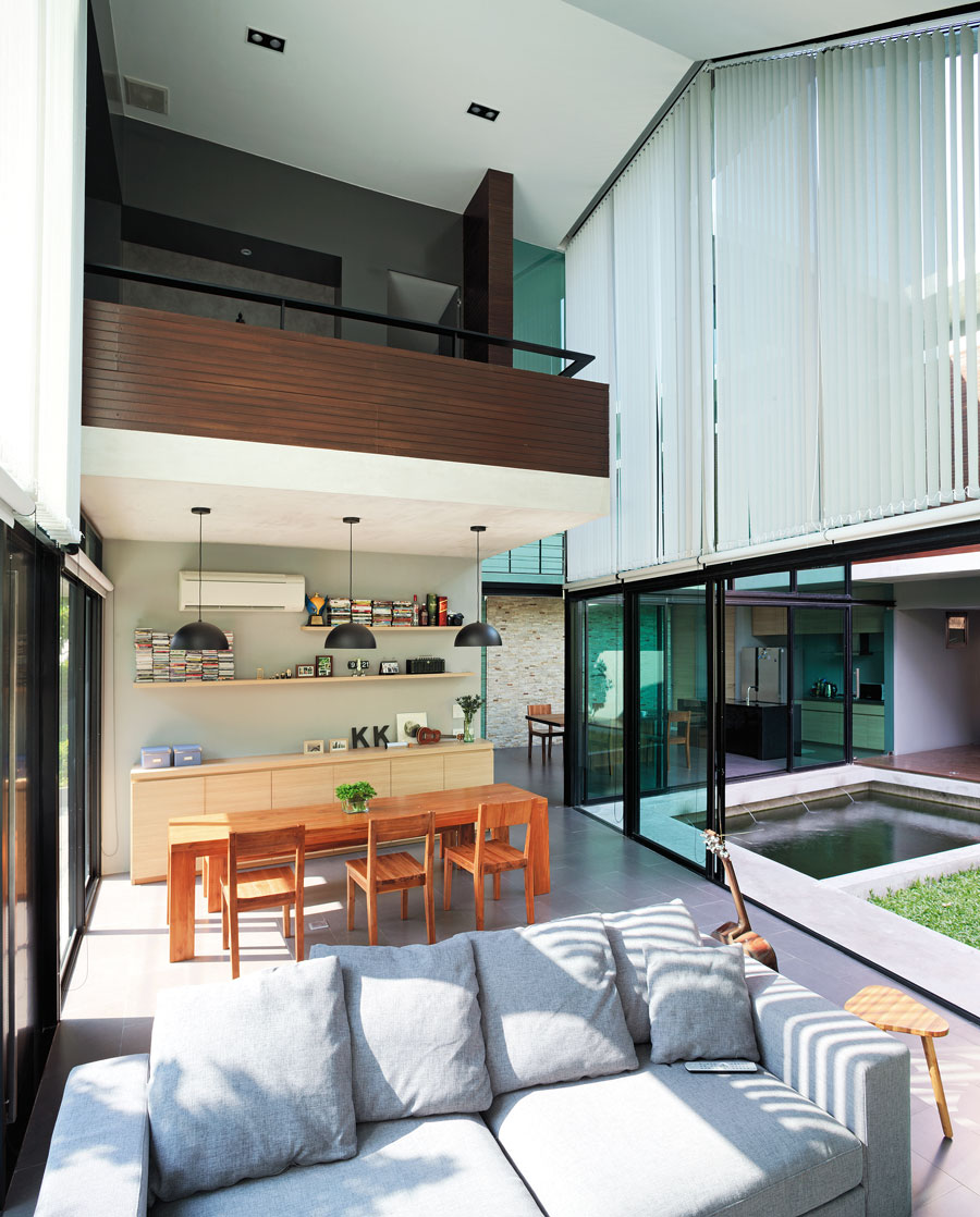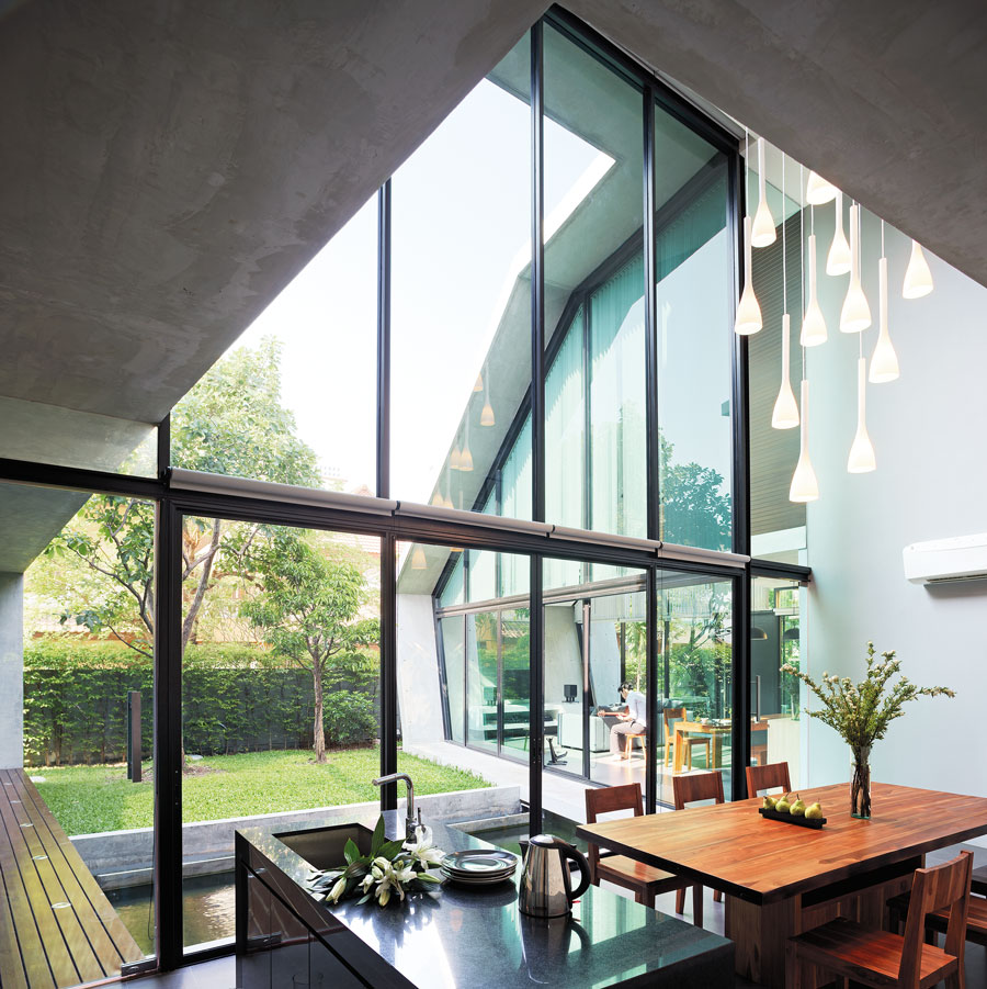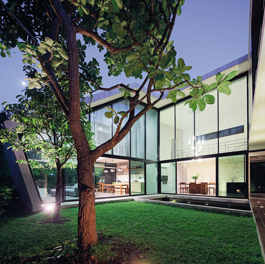 บ้านสไตล์โมเดิร์นหลังนี้น่าจะเป็นตัวอย่างที่แสดงให้เห็นความสัมพันธ์ของการสร้างบ้านให้อยู่ร่วมกับธรรมชาติได้เป็นอย่างดี อันเป็นโจทย์ตั้งต้นในการออกแบบของสถาปนิก เลือกใช้คอนกรีตเป็นวัสดุหลักของบ้านในส่วนที่ต้องการปิด และปล่อยผิววัสดุให้เปลือยดิบตามธรรมชาติ ส่วนมุมที่ต้องการเปิดก็ดูโปร่งด้วยผนังกระจกใสในกรอบเหล็กสีดำ