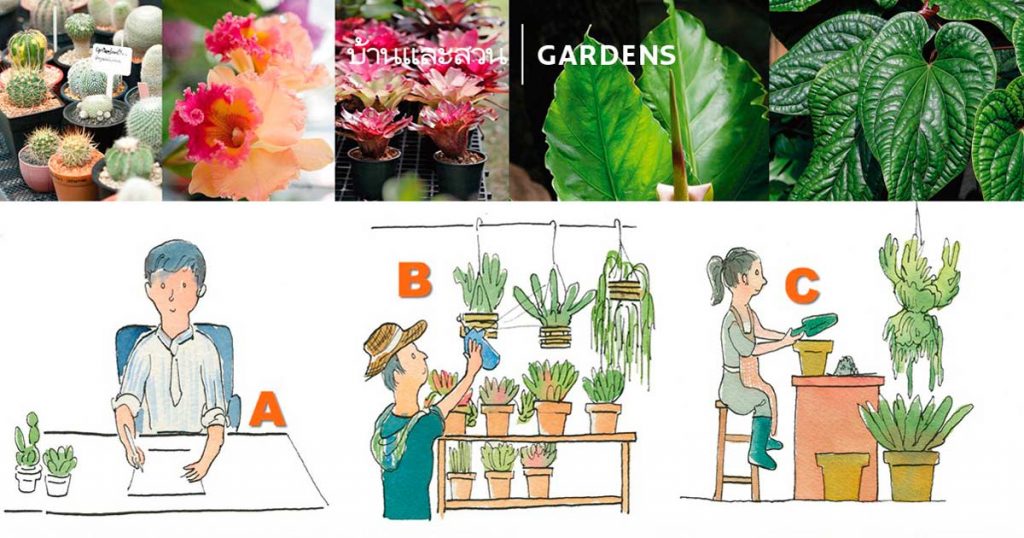 ครั้งนี้ “บ้านและสวน” มีบุคคลสมมติเป็นตัวอย่างคร่าวๆ สำหรับผู้ (อยาก) สะสมต้นไม้มาให้คุณลองเลือก โดยใช้ต้นไม้ที่กำลังนิยมในท้องตลาดมาแนะนำ ลองมาดูว่าไลฟ์สไตล์แบบคุณเหมาะกับต้นไม้ประเภทไหน A B หรือ C