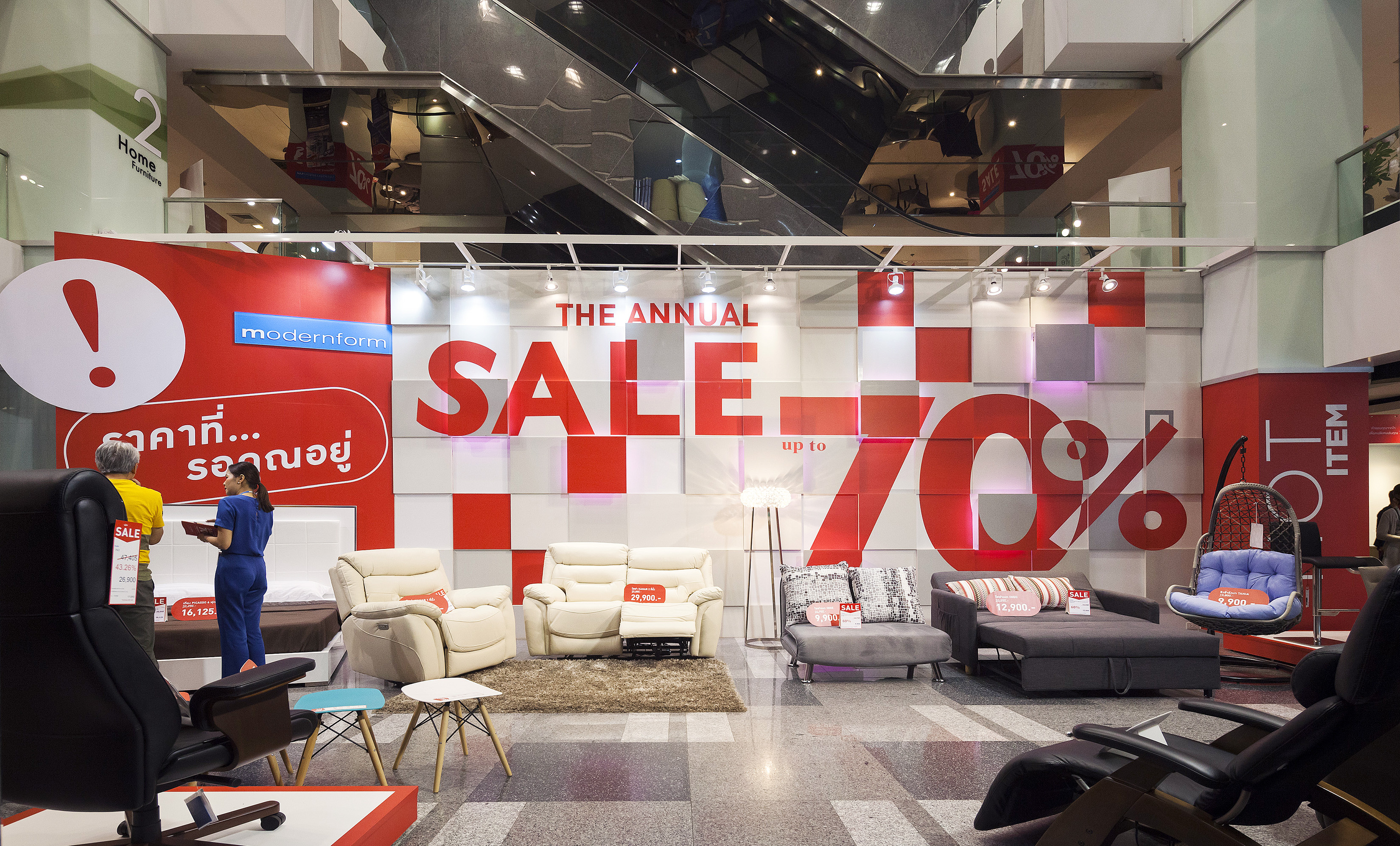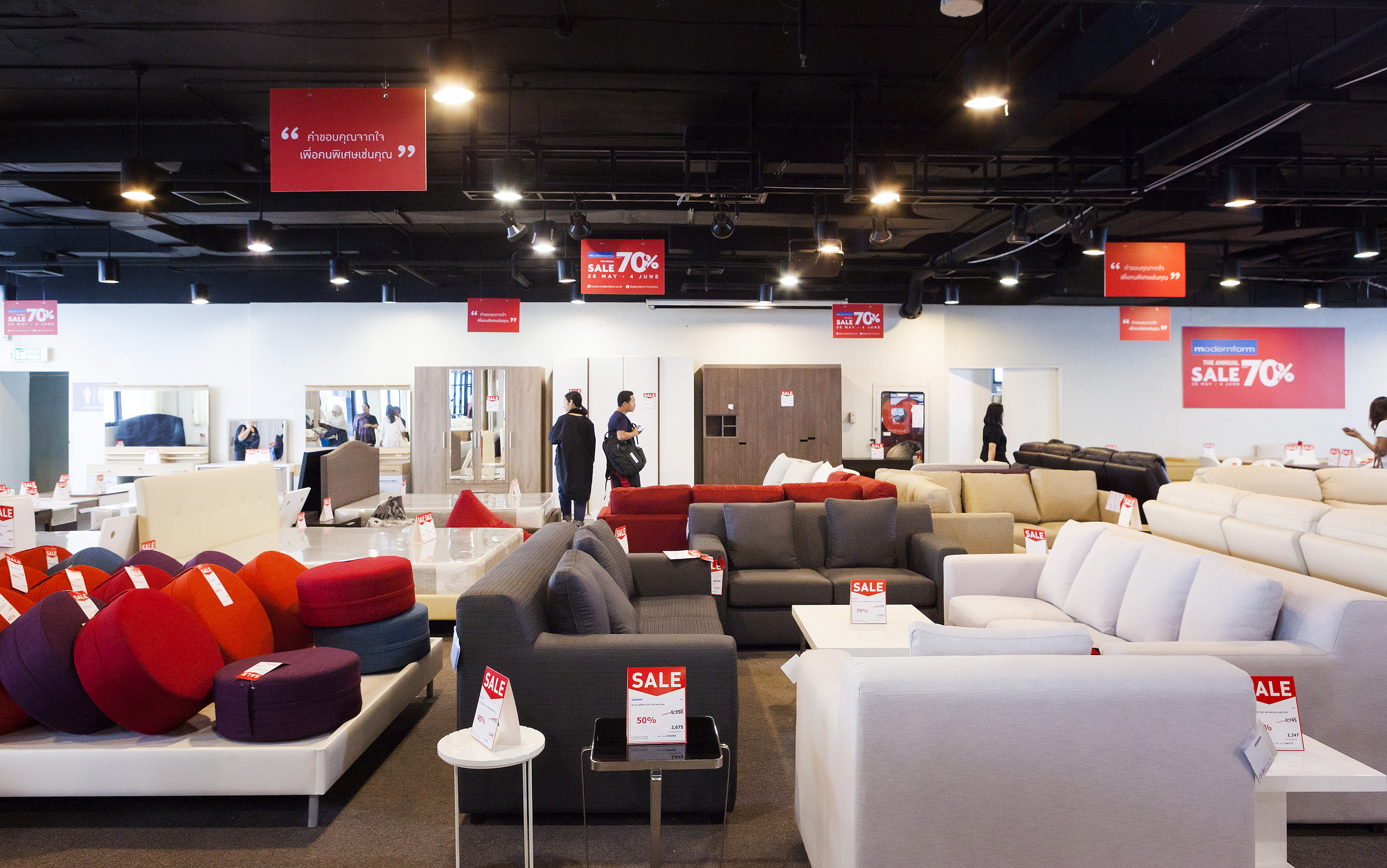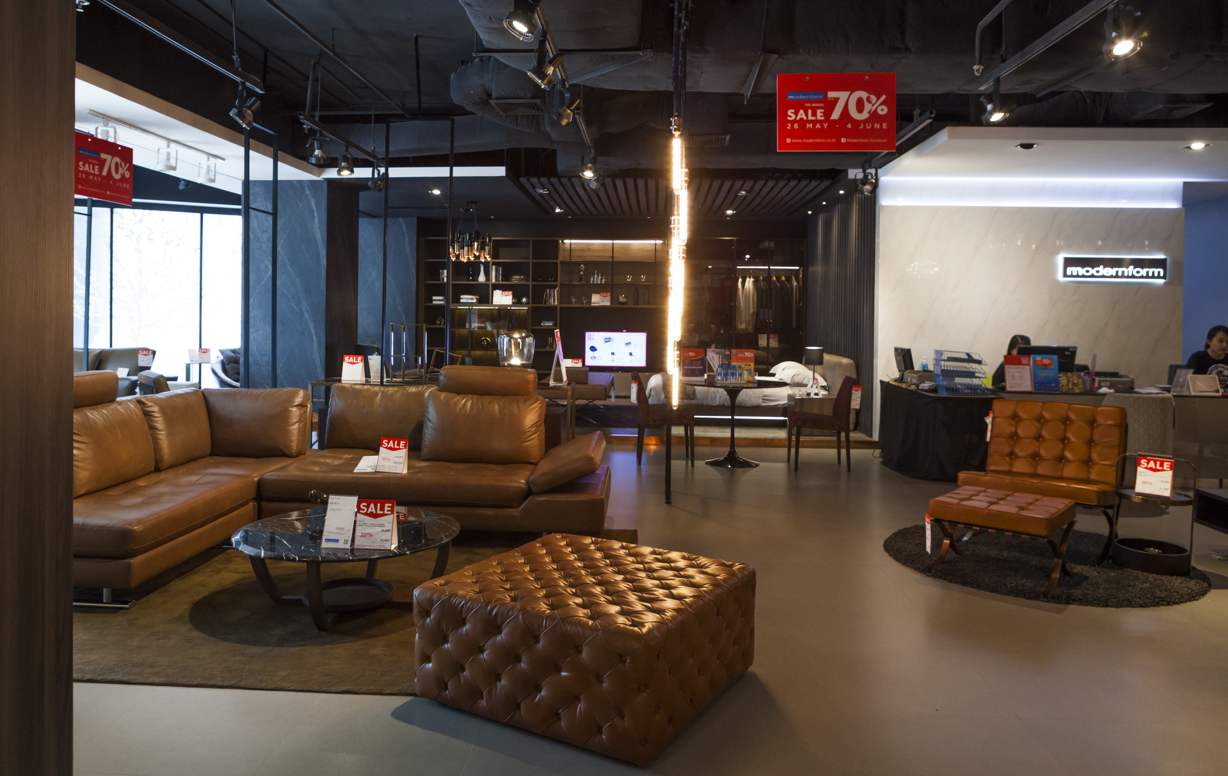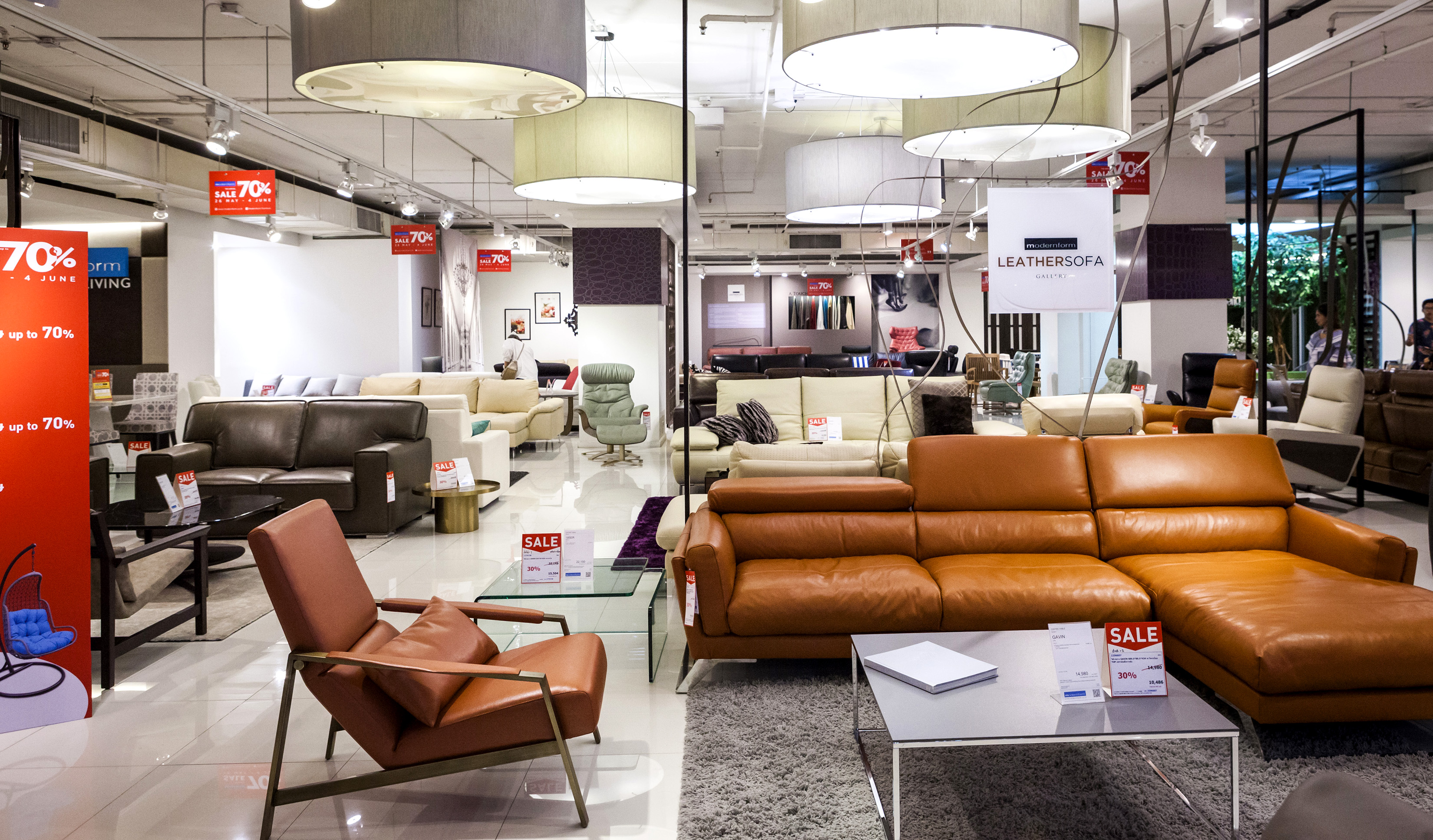 เริ่มกันที่โซนแรก เป็นเฟอร์นิเจอร์และของแต่งบ้าน ซึ่งจะมีตั้งแต่ ชั้น 1-4 ในแต่ละชั้นแบ่งเป็นหมวดหมู่ชัดเจนให้เลือกชมได้ง่าย ไม่ว่าเป็นห้องนอน ห้องนั่งเล่น เฟอร์นิเจอร์นอกบ้าน ที่มีสไตล์แตกต่างกันไป โดยชั้น 1 จะเป็นสินค้าคอลเล็กชั่นใหม่ๆ และสินค้า Signature ของ Modernform ที่พิถีพิถันในงานดีไซน์แบบเรียบ หรู ดูดี เสริมลุคให้บ้านมีสไตล์และเปี่ยมไปด้วยฟังก์ชั่นการใช้งานไม่แพ้ความสวยงามเลย ซึ่งจะลดราคาตั้งแต่ 20% ขึ้นไป ส่วนชั้น 2 จะเน้นไปทางเฟอร์นิเจอร์ Built in และโซฟาหลากสไตล์ทั้งโซฟาหนัง โซฟาผ้า ไปจนถึงสตูลวางเท้าและเบาะนั่ง ชั้น 3 จะเป็นเฟอร์นิเจอร์สไตล์ luxury, Classic และ Leather Sofa Gallery โซฟาหนังแท้คุณภาพดี ใครที่กำลังมองหางานดีไซน์เรียบหรู ต้องไม่พลาดชั้นนี้ และนอกจากนี้ยังมีเฟอร์นิเจอร์นอกอาคารด้วย ส่วนสินค้าไฮไลต์ที่ลดราคาสูงสุดถึง 70% จะอยู่ที่ชั้น 5 และ 28 ครับ