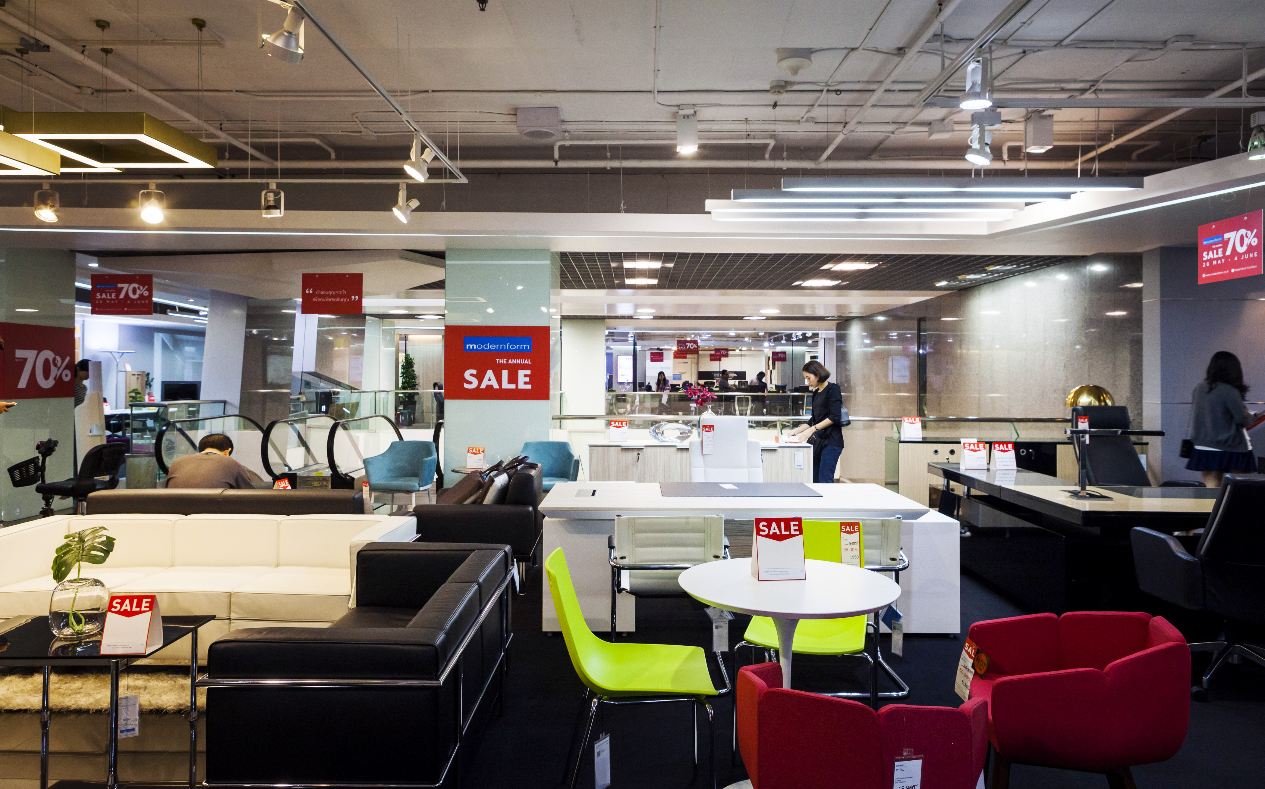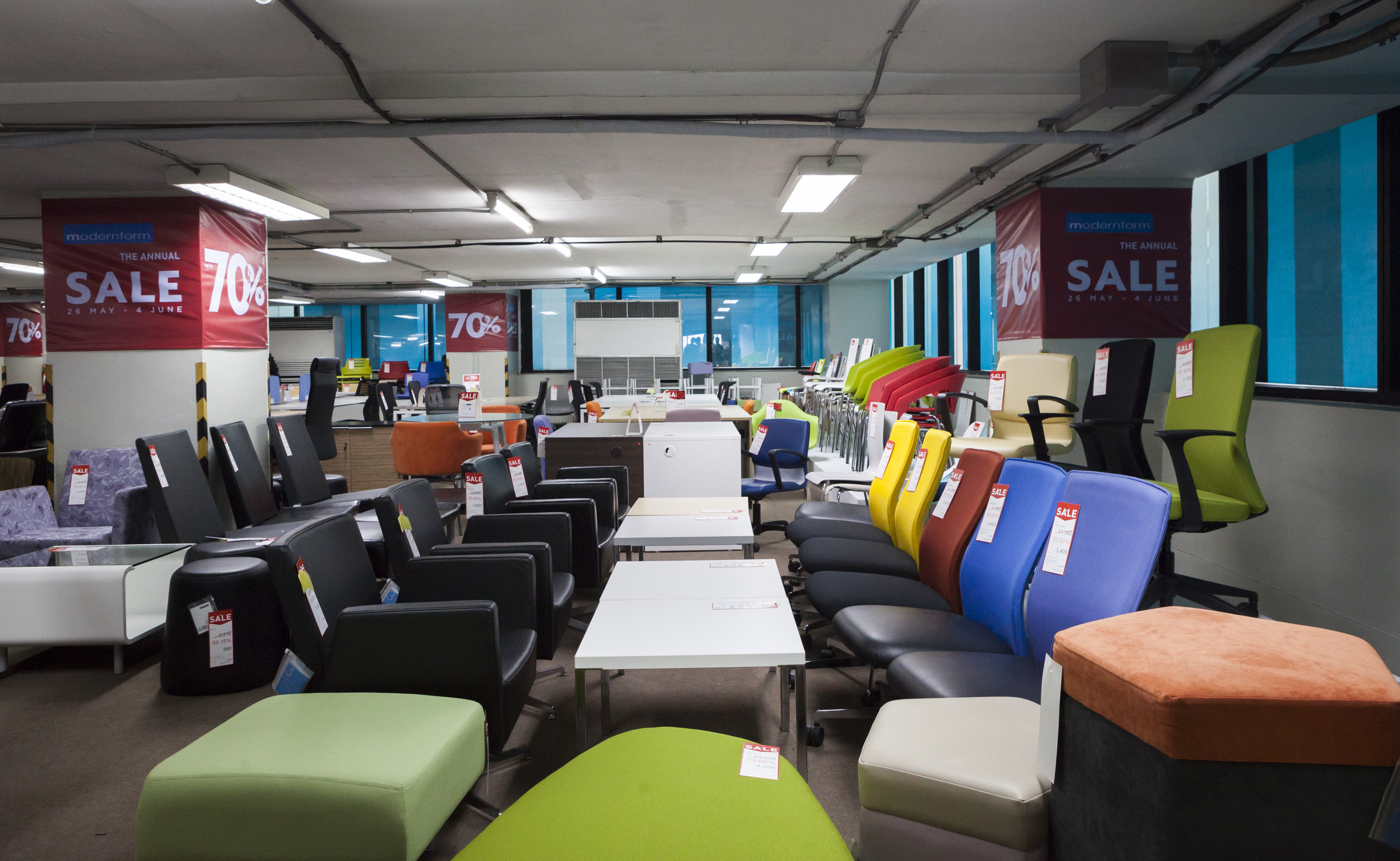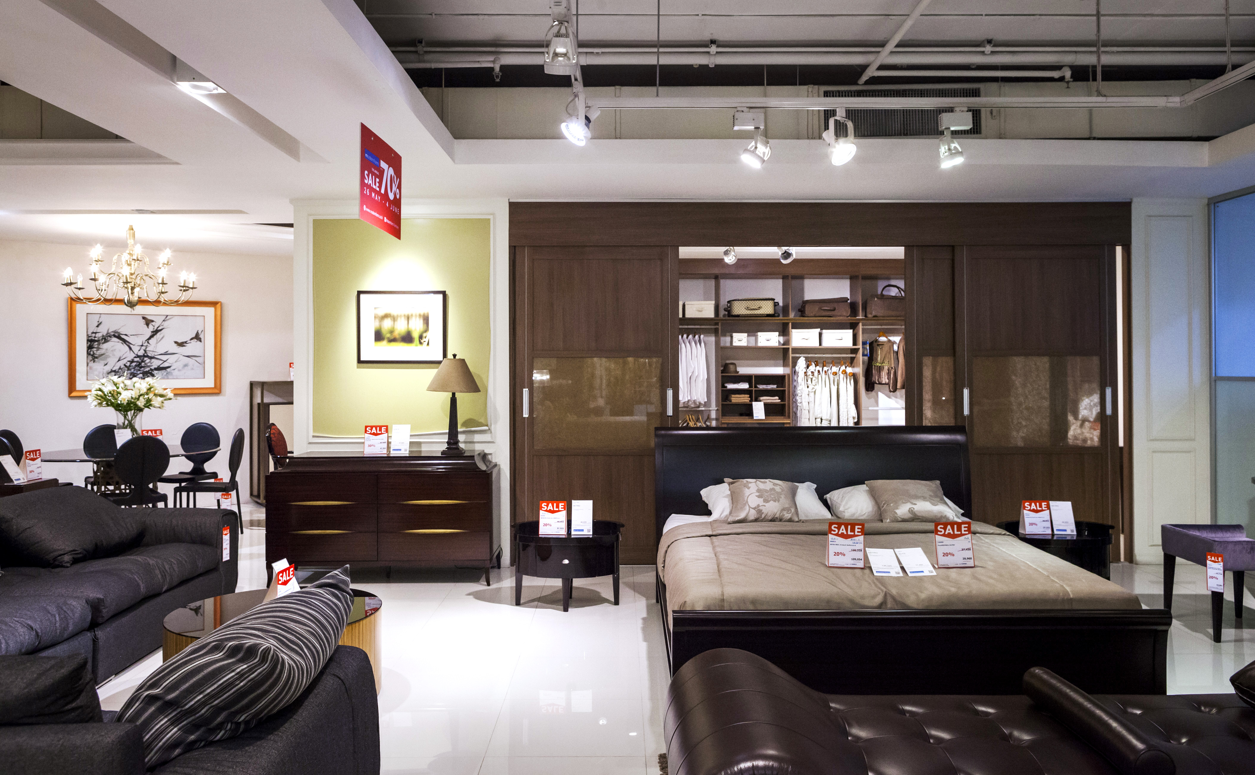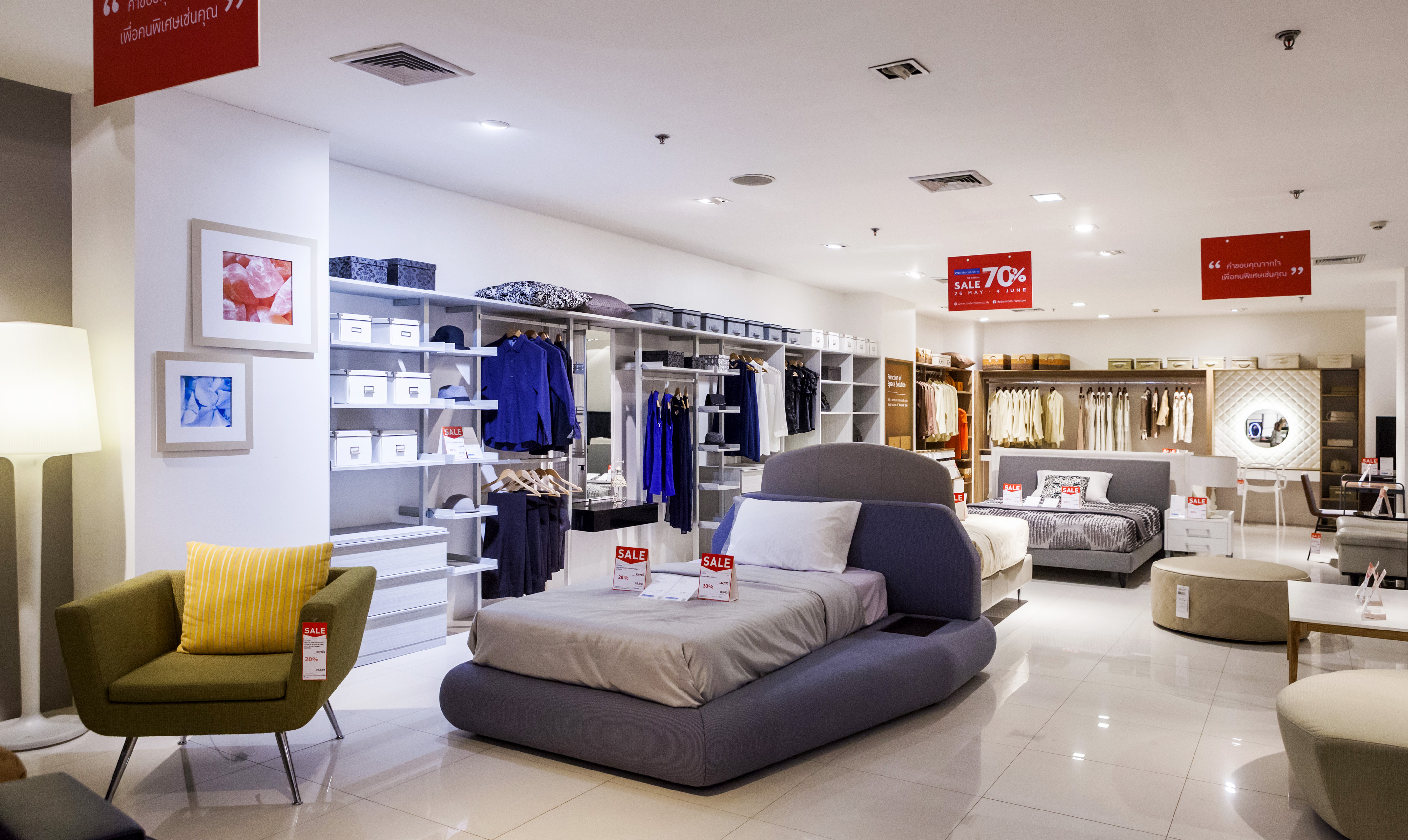 เริ่มกันที่โซนแรก เป็นเฟอร์นิเจอร์และของแต่งบ้าน ซึ่งจะมีตั้งแต่ ชั้น 1-4 ในแต่ละชั้นแบ่งเป็นหมวดหมู่ชัดเจนให้เลือกชมได้ง่าย ไม่ว่าเป็นห้องนอน ห้องนั่งเล่น เฟอร์นิเจอร์นอกบ้าน ที่มีสไตล์แตกต่างกันไป โดยชั้น 1 จะเป็นสินค้าคอลเล็กชั่นใหม่ๆ และสินค้า Signature ของ Modernform ที่พิถีพิถันในงานดีไซน์แบบเรียบ หรู ดูดี เสริมลุคให้บ้านมีสไตล์และเปี่ยมไปด้วยฟังก์ชั่นการใช้งานไม่แพ้ความสวยงามเลย ซึ่งจะลดราคาตั้งแต่ 20% ขึ้นไป ส่วนชั้น 2 จะเน้นไปทางเฟอร์นิเจอร์ Built in และโซฟาหลากสไตล์ทั้งโซฟาหนัง โซฟาผ้า ไปจนถึงสตูลวางเท้าและเบาะนั่ง ชั้น 3 จะเป็นเฟอร์นิเจอร์สไตล์ luxury, Classic และ Leather Sofa Gallery โซฟาหนังแท้คุณภาพดี ใครที่กำลังมองหางานดีไซน์เรียบหรู ต้องไม่พลาดชั้นนี้ และนอกจากนี้ยังมีเฟอร์นิเจอร์นอกอาคารด้วย ส่วนสินค้าไฮไลต์ที่ลดราคาสูงสุดถึง 70% จะอยู่ที่ชั้น 5 และ 28 ครับ