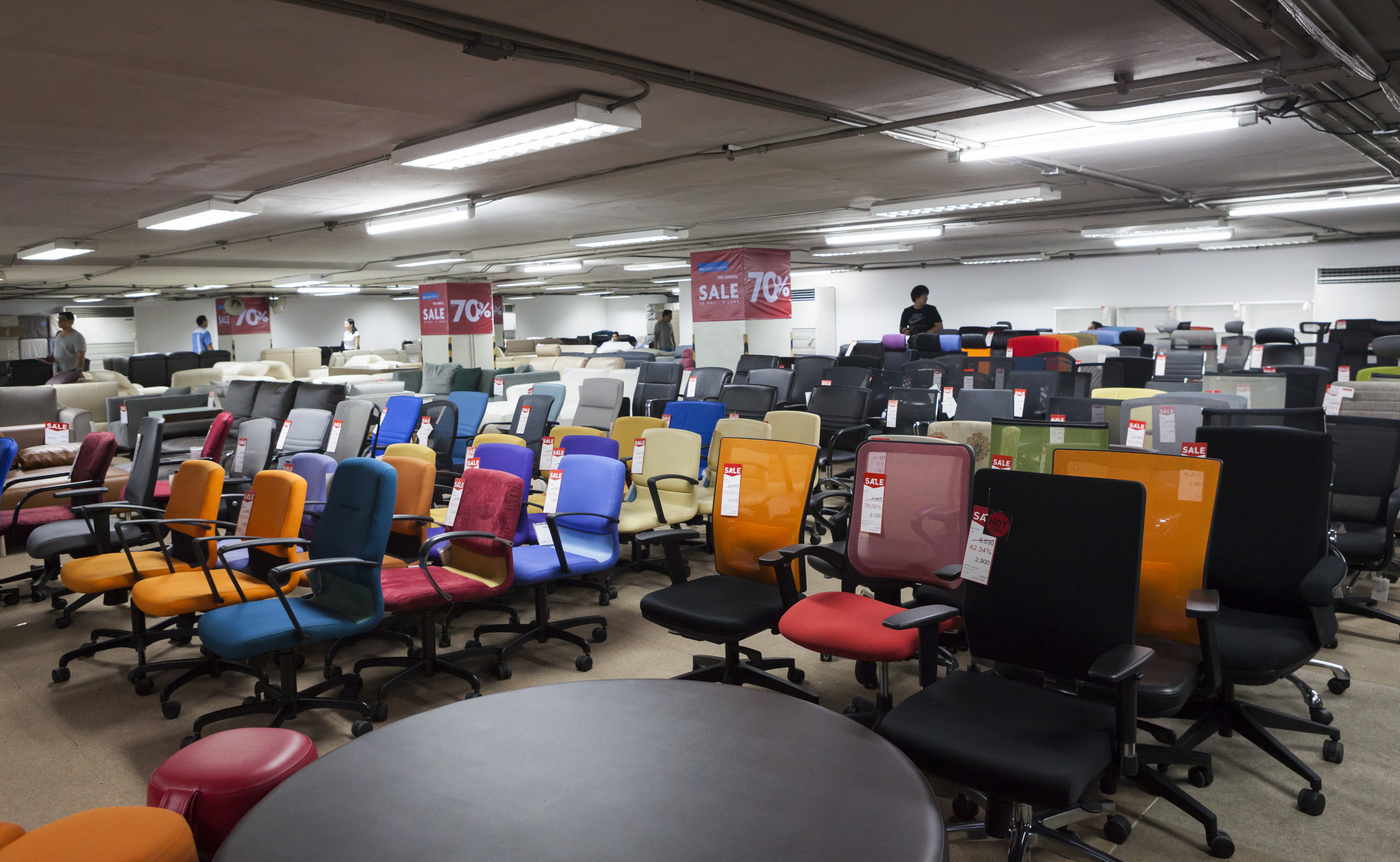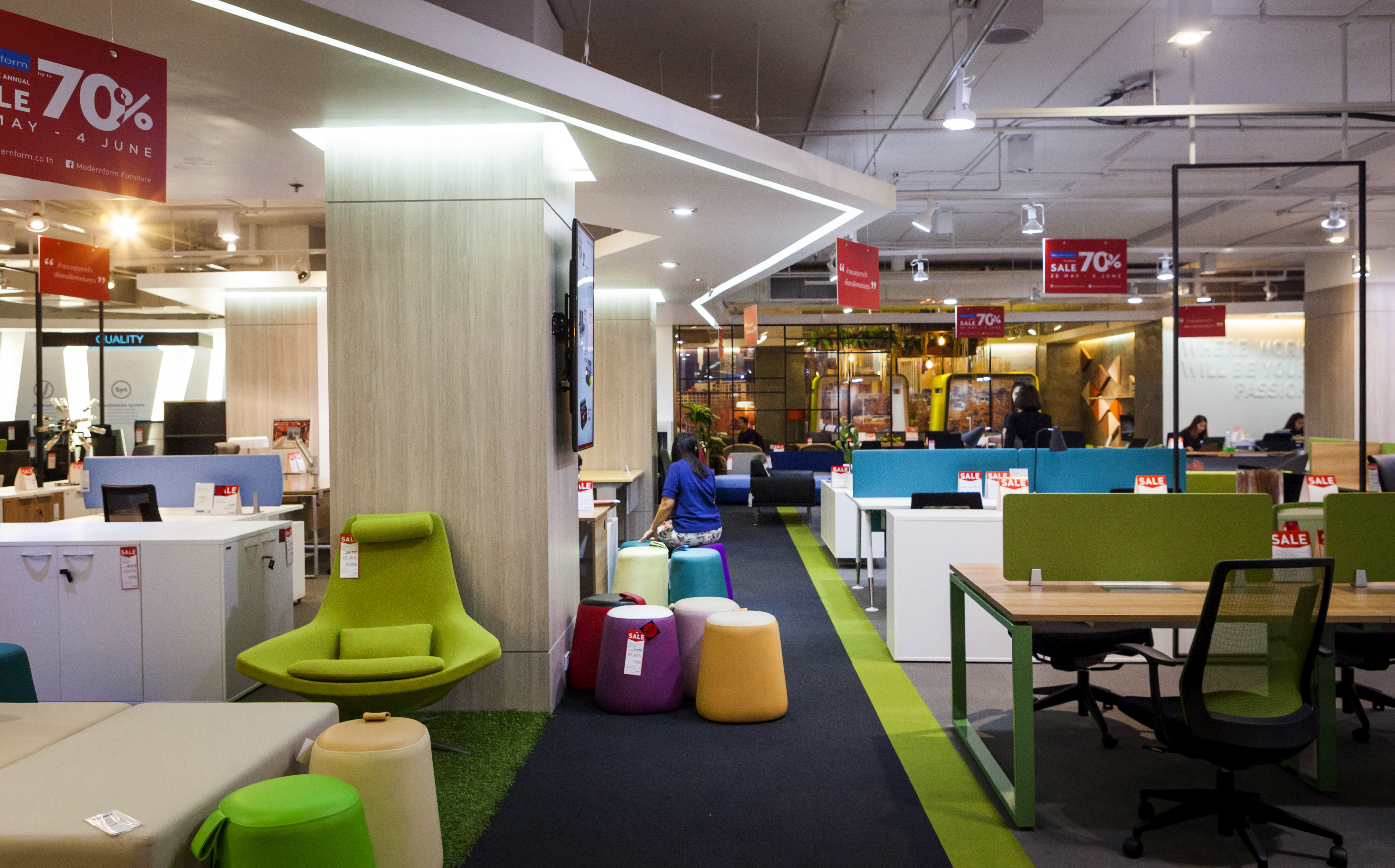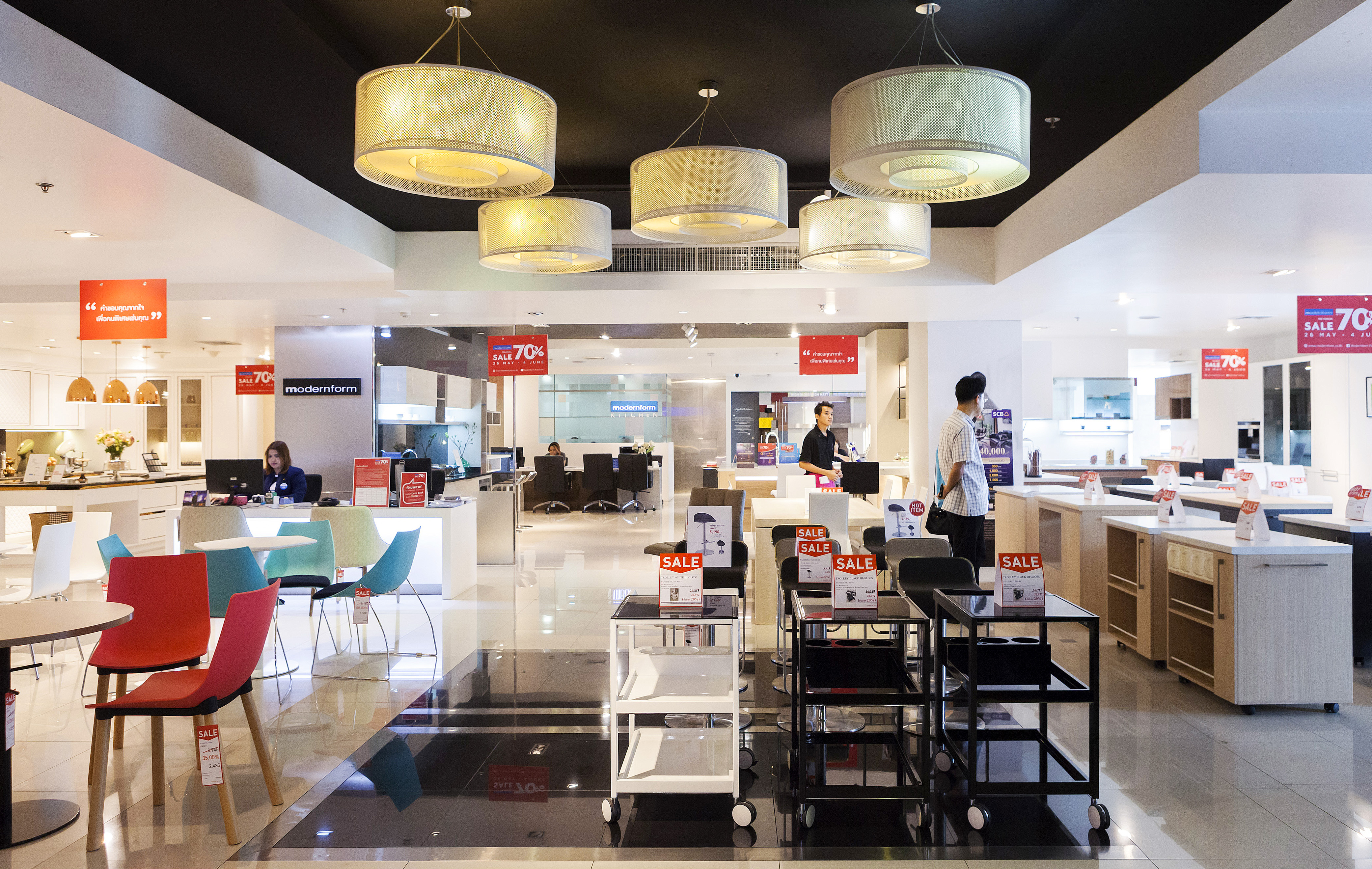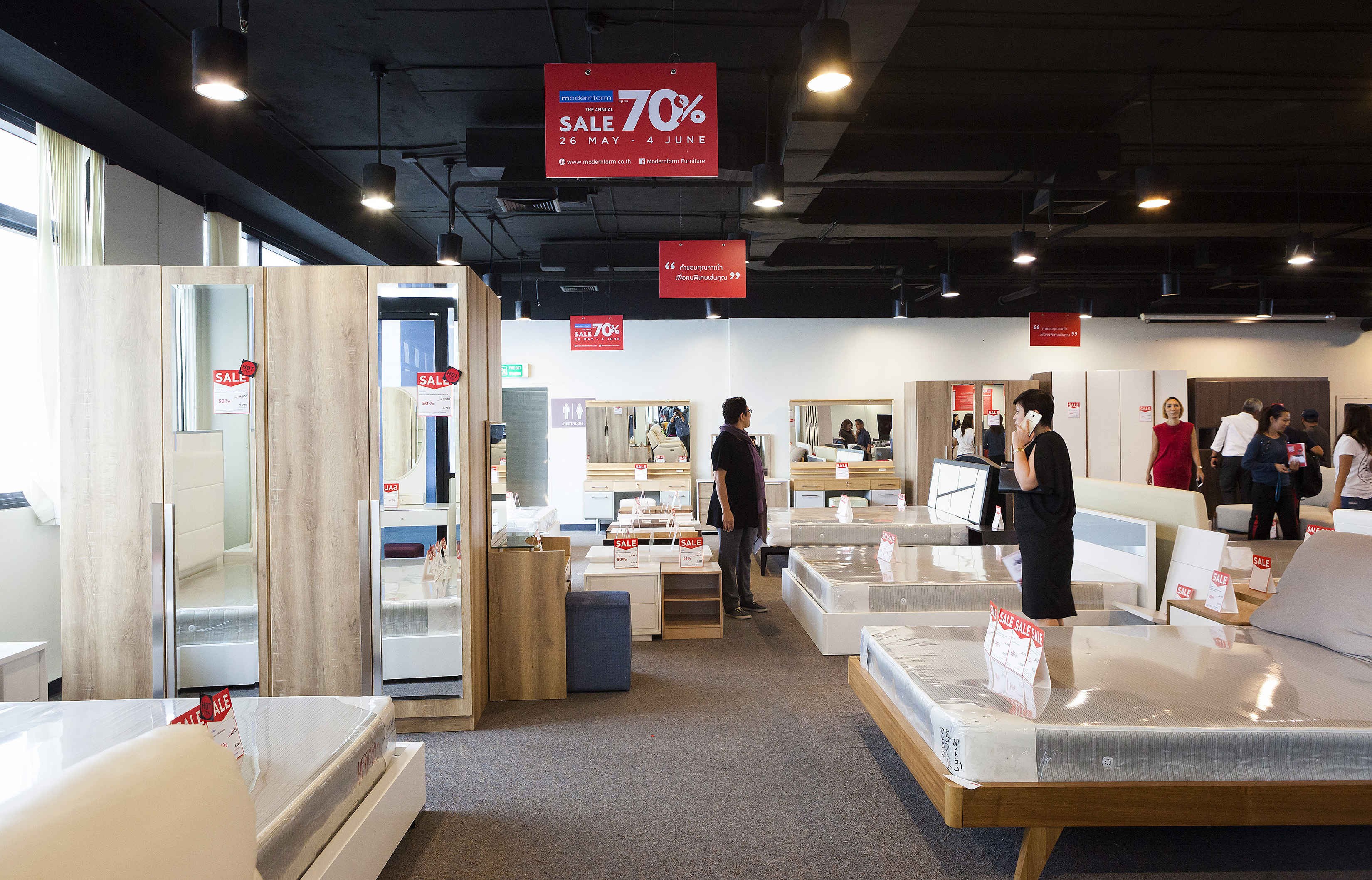 เริ่มกันที่โซนแรก เป็นเฟอร์นิเจอร์และของแต่งบ้าน ซึ่งจะมีตั้งแต่ ชั้น 1-4 ในแต่ละชั้นแบ่งเป็นหมวดหมู่ชัดเจนให้เลือกชมได้ง่าย ไม่ว่าเป็นห้องนอน ห้องนั่งเล่น เฟอร์นิเจอร์นอกบ้าน ที่มีสไตล์แตกต่างกันไป โดยชั้น 1 จะเป็นสินค้าคอลเล็กชั่นใหม่ๆ และสินค้า Signature ของ Modernform ที่พิถีพิถันในงานดีไซน์แบบเรียบ หรู ดูดี เสริมลุคให้บ้านมีสไตล์และเปี่ยมไปด้วยฟังก์ชั่นการใช้งานไม่แพ้ความสวยงามเลย ซึ่งจะลดราคาตั้งแต่ 20% ขึ้นไป ส่วนชั้น 2 จะเน้นไปทางเฟอร์นิเจอร์ Built in และโซฟาหลากสไตล์ทั้งโซฟาหนัง โซฟาผ้า ไปจนถึงสตูลวางเท้าและเบาะนั่ง ชั้น 3 จะเป็นเฟอร์นิเจอร์สไตล์ luxury, Classic และ Leather Sofa Gallery โซฟาหนังแท้คุณภาพดี ใครที่กำลังมองหางานดีไซน์เรียบหรู ต้องไม่พลาดชั้นนี้ และนอกจากนี้ยังมีเฟอร์นิเจอร์นอกอาคารด้วย ส่วนสินค้าไฮไลต์ที่ลดราคาสูงสุดถึง 70% จะอยู่ที่ชั้น 5 และ 28 ครับ