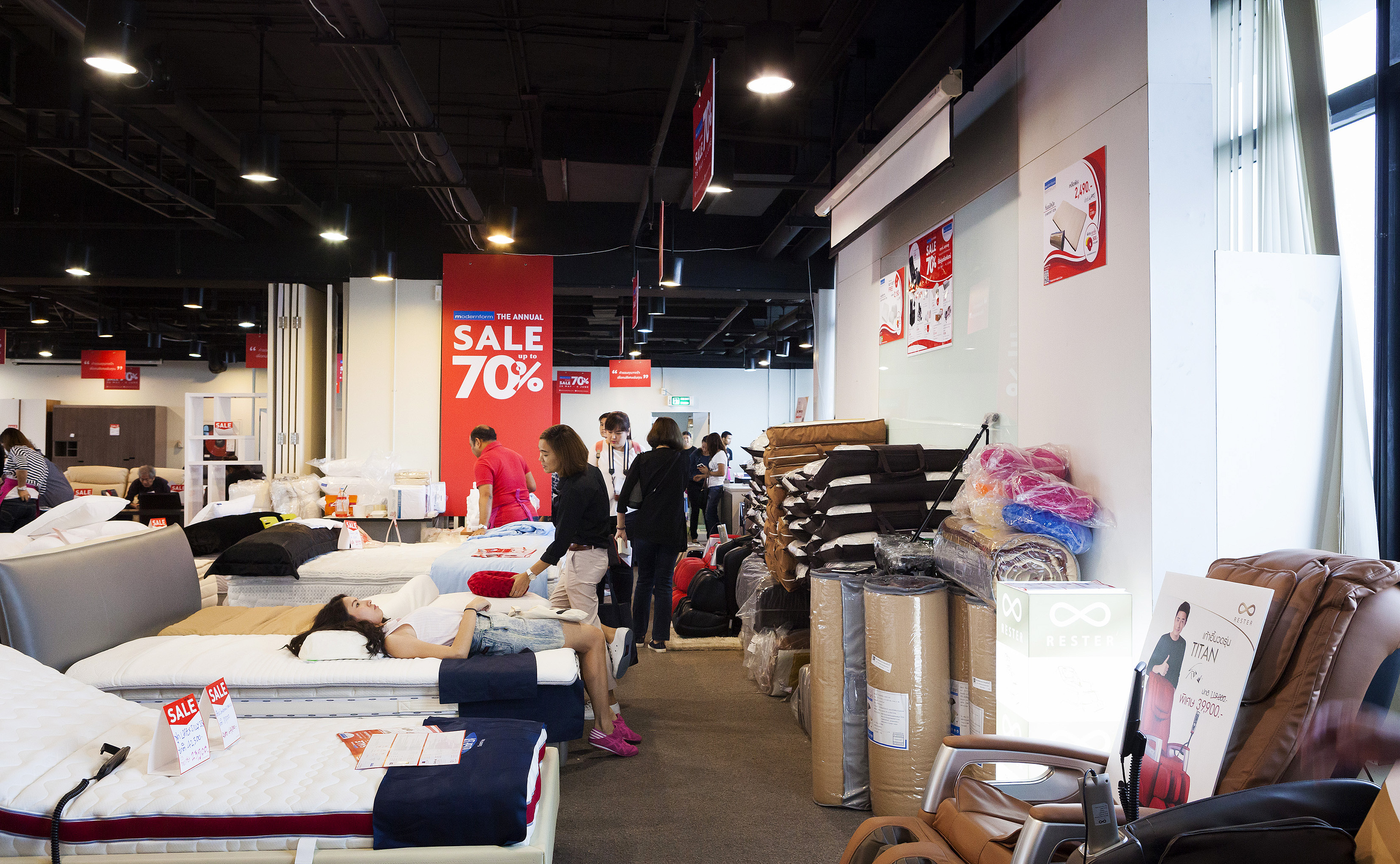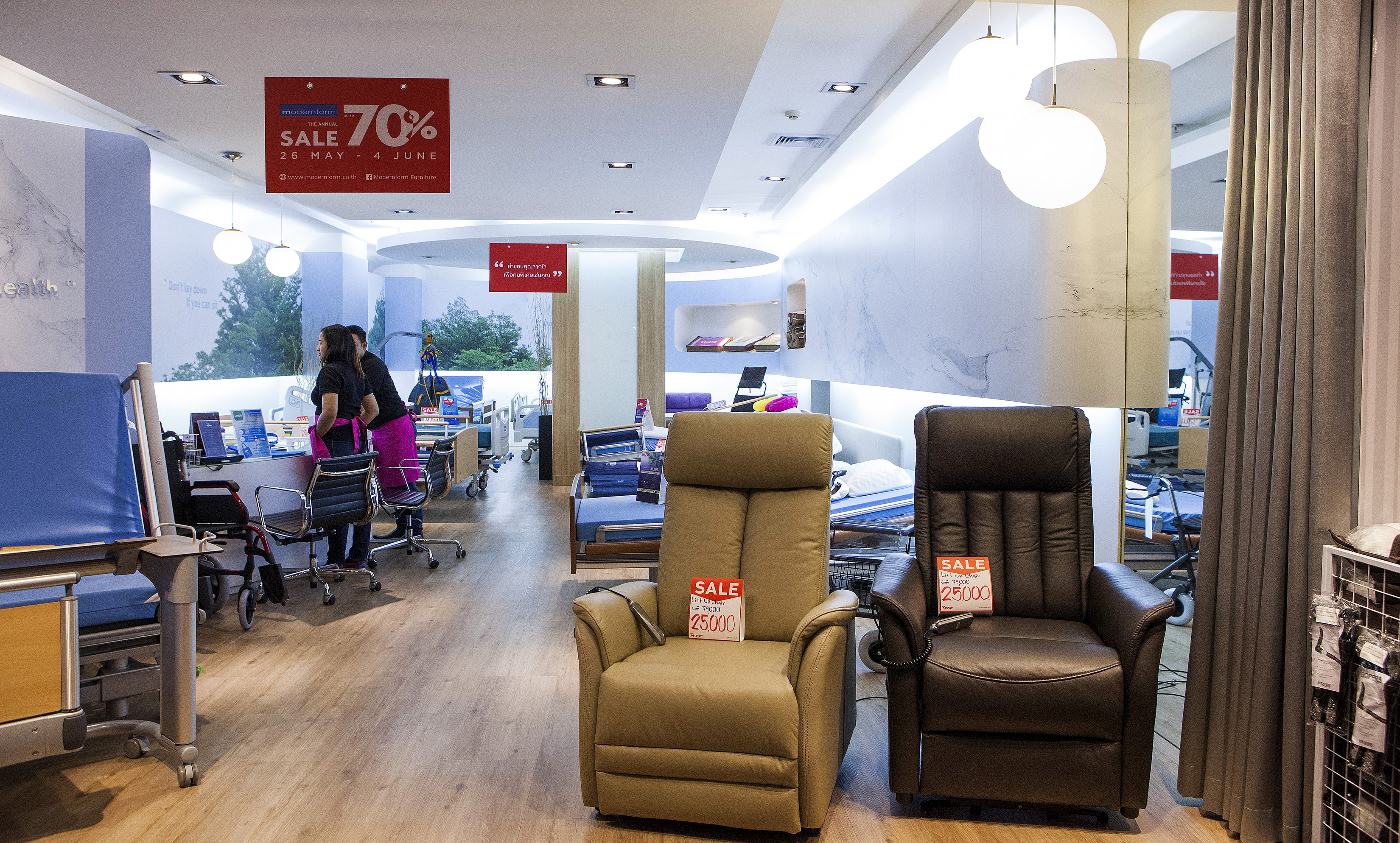 ไม่ใช่แค่สินค้าที่ตอบโจทย์ไลฟ์สไตล์เท่านั้น คราวนี้ Modernform ยังเอาใจคนรักสุขภาพ และเตรียมพร้อมเข้าสู่สังคมผู้สูงอายุ ด้วยเฟอร์นิเจอร์สำหรับคนรักสุขภาพ อย่างเบาะนวดไฟฟ้า เก้าอี้พักผ่อน เฟอร์นิเจอร์สำหรับผู้สูงอายุ วีลแชร์ เตียงไฟฟ้าพร้อมที่นอนนำเข้า ออกแบบมาจากการศึกษาพฤติกรรมและปัญหาต่างๆ ของผู้สูงอายุหรือผู้ป่วยจริงๆ ให้เลือกสรรหลายแบบ ส่วนที่เราสนใจเป็นพิเศษจะเป็นหมอนยางพาราเพื่อสุขภาพ ที่สามารถปรับรูปร่างตามน้ำหนักศรีษะและต้นคอ นั่งแล้วนุ่มสบาย ใครที่มีปัญหาด้านการนอนน่าสนใจทีเดียวครับ ซึ่งทั้งหมดนี้จะอยู่ด้านในสุดบริเวณชั้น 1 และมีให้เลือกเพิ่มเติม ในชั้น 28 ด้วยครับ
