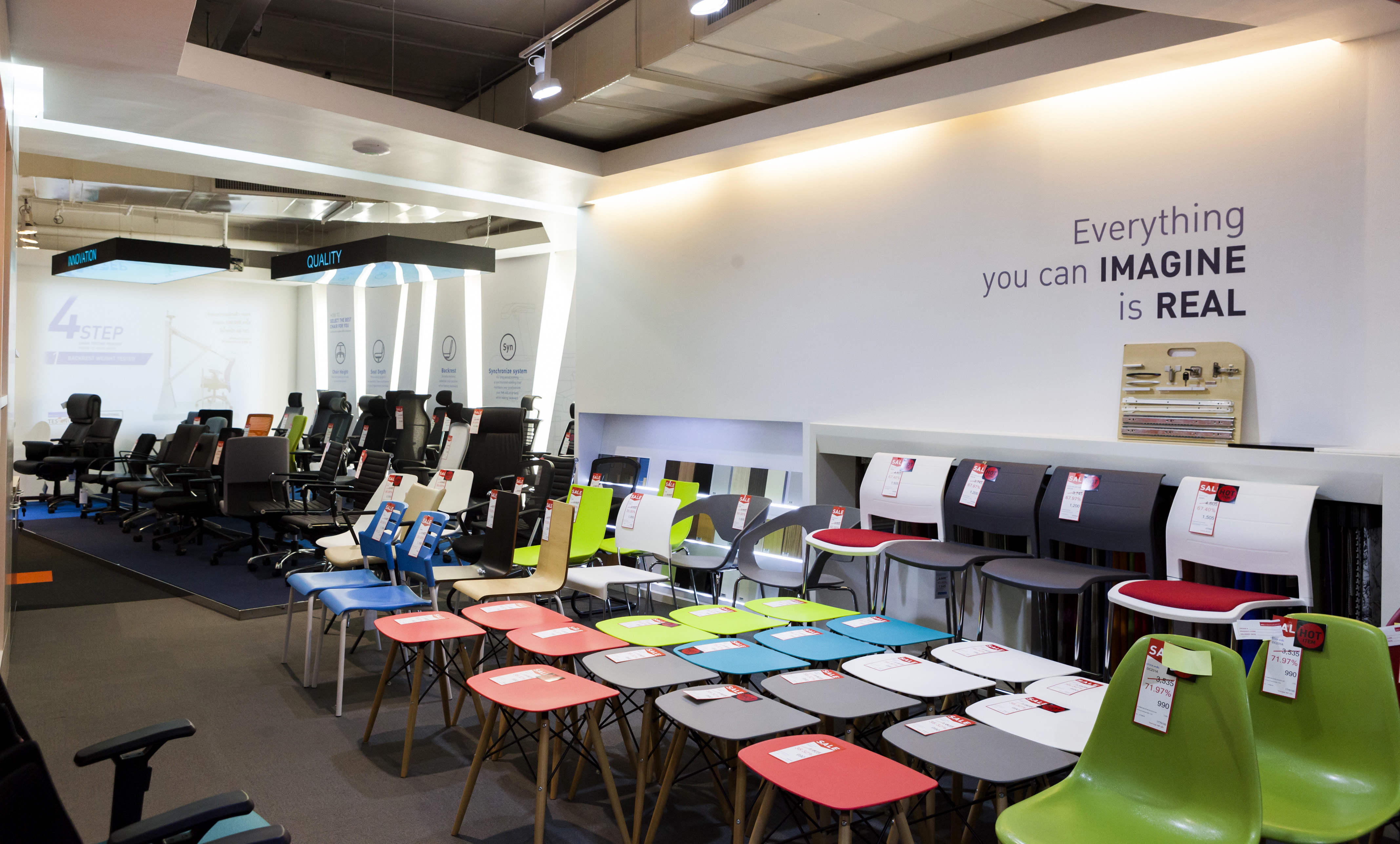 การทำงานให้มีความสุขไม่ใช่แค่ได้ทำงานที่ชอบ หรือในบรรยากาศแวดล้อมที่ดีเท่านั้น ไม่ว่าคุณจะมีเฟอร์นิเจอร์ฟังก์ชั่นครบตอบโจทย์ในทุกการทำงาน หรือเพียงแค่มีเก้าอี้ที่นั่งสบายๆ สักตัว ก็ช่วยให้ทำงานได้อย่างมีประสิทธิภาพแล้ว ฉะนั้นเราขอมาต่อกันที่ชั้น 4ซึ่งเป็นชั้นที่รวมเฟอร์นิเจอร์ สำนักงานให้เลือกหลากหลาย ตั้งแต่โต๊ะทำงาน เก้าอี้ โต๊ะผู้บริหาร ชุดโต๊ะ สำหรับห้องประชุมครบชุด ทั้งสไตล์โมเดิร์นเก๋เท่ ไปจนถึงดีไซน์เรียบเท่ ต้องบอกก่อนว่าชั้นนี้จะเป็นสินค้าคอลเล็กชั่นใหม่ ลดราคาพิเศษเริ่มต้นที่ 20% ครับ แต่ถ้ายังไม่ถูกใจ เราขอพาคุณขึ้นไปที่ชั้น 5 ซึ่งเป็นโซนไฮไลต์ของเฟอร์นิเจอร์สำหรับออฟฟิศคุณจะได้พบกับโต๊ะ-เก้าอี้ หลากหลายสไตล์ให้เลือกอย่างจุใจ ในราคาที่ลดสุงสุด 70 % แน่นอน
