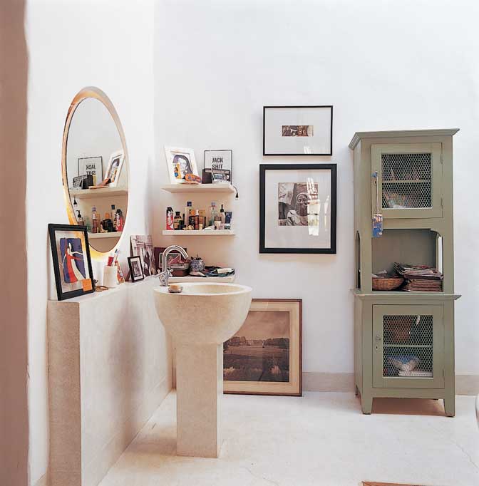 แต่พอเดินต่อมายังคอร์ตยาร์ดและบริเวณส่วนหลังของบ้านจะพบว่าโทนสีของบ้านเริ่มอ่อนลง ผนังจะมีสีออกขาวหรือขาวอมเหลือง ห้องน้ำนอกจากจะทาสีขาวสะอาดตาแล้ว ยังได้แสงธรรมชาติที่ส่องเข้ามาในห้อง ทำให้ดูสว่าง จุดเด่นของห้องน้ำในบ้านนี้อยู่ที่สุขภัณฑ์ต่างๆซึ่งสวยแบบง่ายๆไม่เหมือนใคร เจ้าของบ้านเลือกที่จะไม่ใช้สุขภัณฑ์หรือกระเบื้องที่หาซื้อได้ทั่วไป (ยกเว้นโถชักโครก) “ผมให้ช่างหล่อปูนทำเป็นสุขภัณฑ์หินขัดทั้งหมด อยากได้ความสูงหรือขนาดเท่าไหร่ก็ทำได้ ห้องอาบน้ำ ชั้นวางของ พื้น ผนัง ถังเก็บน้ำหลังโถชักโครก และอ่างล้างหน้า ใช้วัสดุและสีเดียวกันทั้งหมด” คุณแจ็คบอกอย่างภูมิใจ