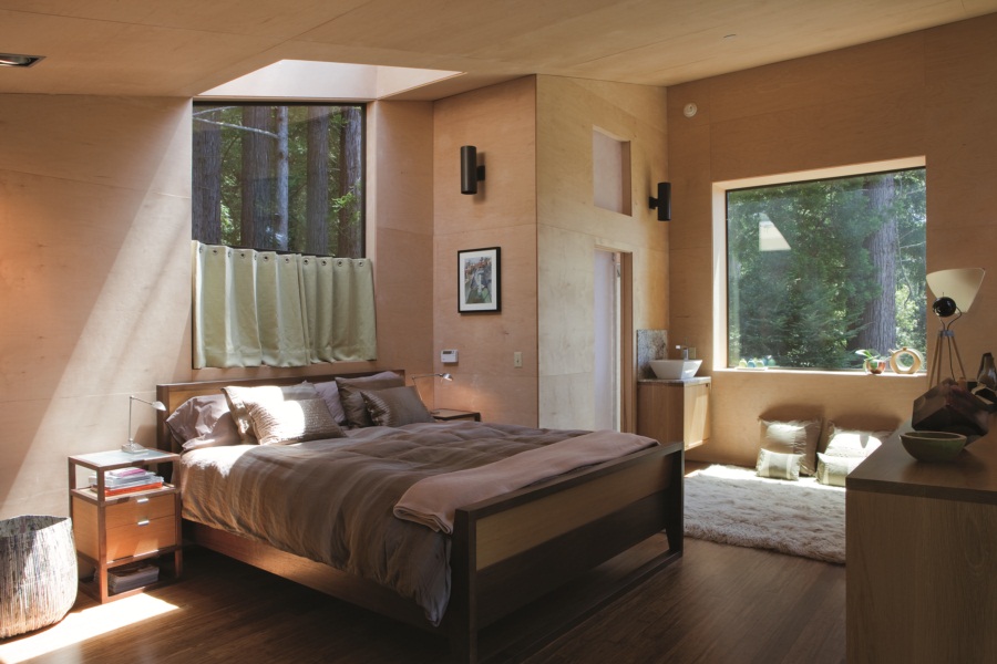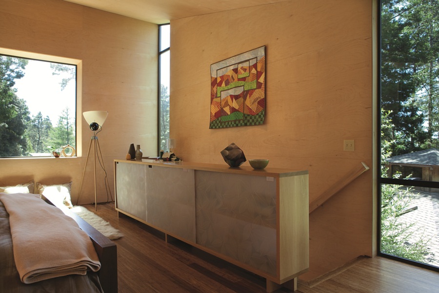 “การตกแต่ง บ้านไม้หลักเล็ก นี้ให้เรียบเกลี้ยงด้วยไม้ เพราะเมือง Sea Ranch มีเอกลักษณ์ที่เห็นได้ชัด คือการก่อสร้างด้วยไม้ทั้งหลัง โดยไม่ทาสีไม้แต่เน้นการเคลือบผิวหรือการย้อมบางๆโชว์เนื้อไม้แทน ผนังโดยรอบรวมถึงฝ้าเพดานออกแบบโดยใช้แผ่นไม้อัดกรุวีเนียร์ ตีชิดเรียบเสมอกันเสมือนเป็นกล่องไม้”