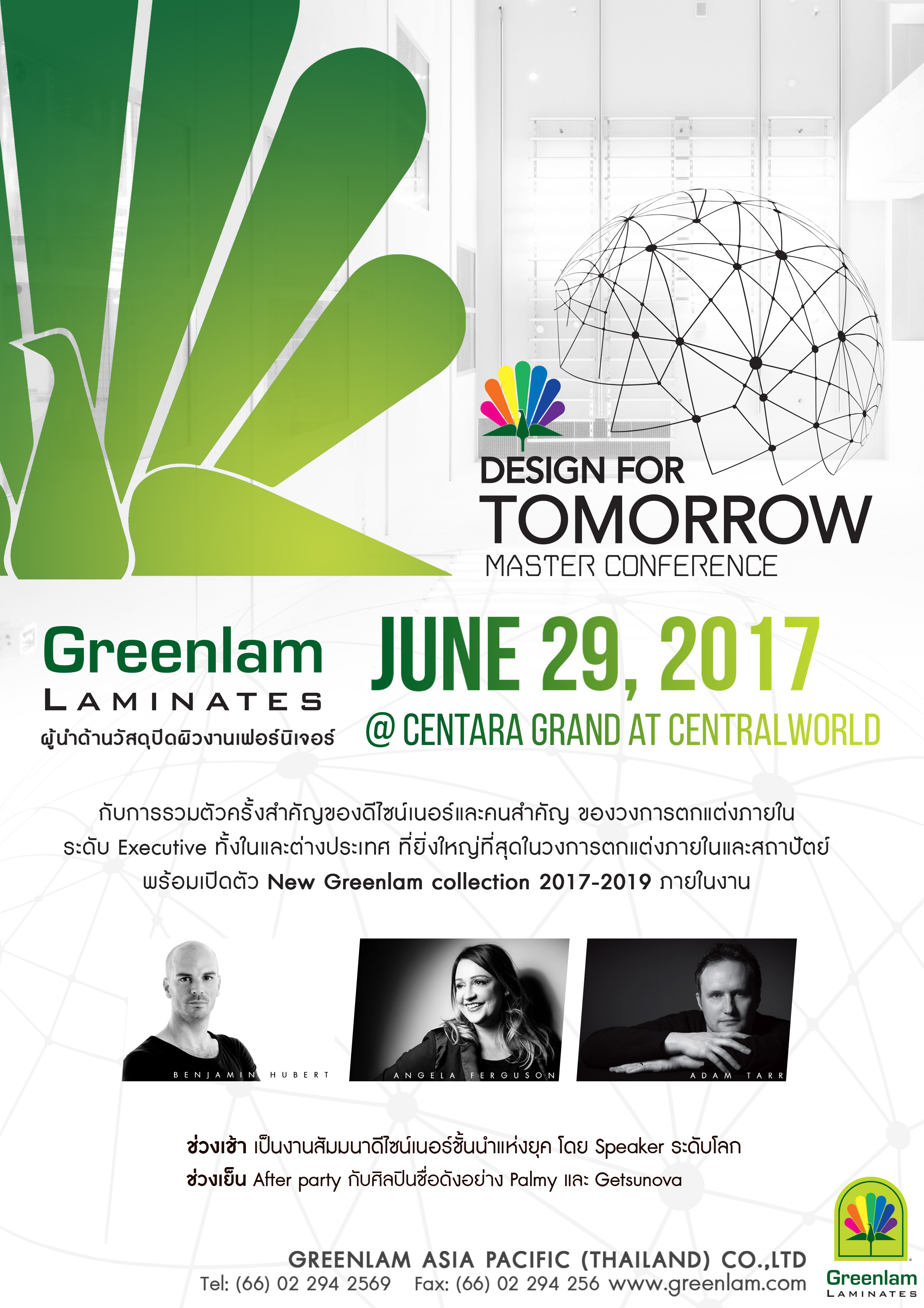 บริษัท กรีนแลม เอเชีย แปซิฟิค (ประเทศไทย) จำกัด ได้เป็นโฮสต์ของการ จัดงานใหญ่ DESIGN FOR TOMORROW MASTER CONFERENCE งานสัมมนาครั้งยิ่งใหญ่ของวงการตกแต่งภายใน ที่จะเกิดขึ้นในวันที่ 29 มิถุนายนนี้ ณ Centara Grand Hotel @ CentralWorld Bangkok