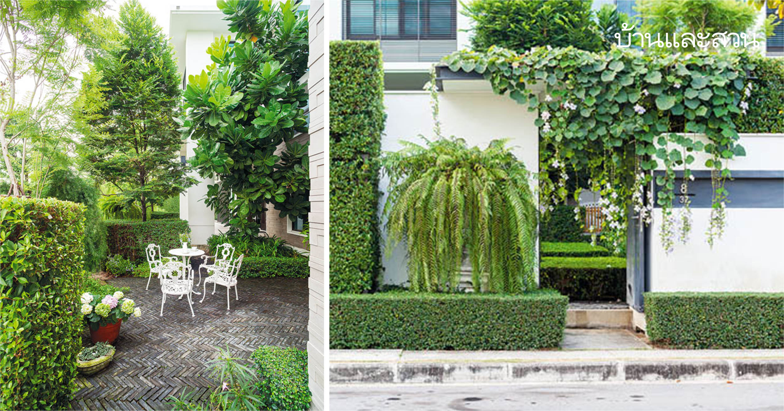 แนวไทรเกาหลีและชาดัดตัดแต่งรูปทรงล้อกับกำแพงรั้วสีขาวทึบ บ่งบอกสไตล์ โมเดิร์นอิงลิช ที่รับกับบ้านรูปทรงโมเดิร์นคอนเทมโพรารีได้เป็นอย่างดี ซุ้มประตูเข้าบ้านปกคลุมด้วยสร้อยอินทนิลที่ผลิดอกสีม่วงห้อยลงมาอย่างสวยงาม ข้างกันเป็นกระถางเอิร์นปลูกเฟินสไบนาง