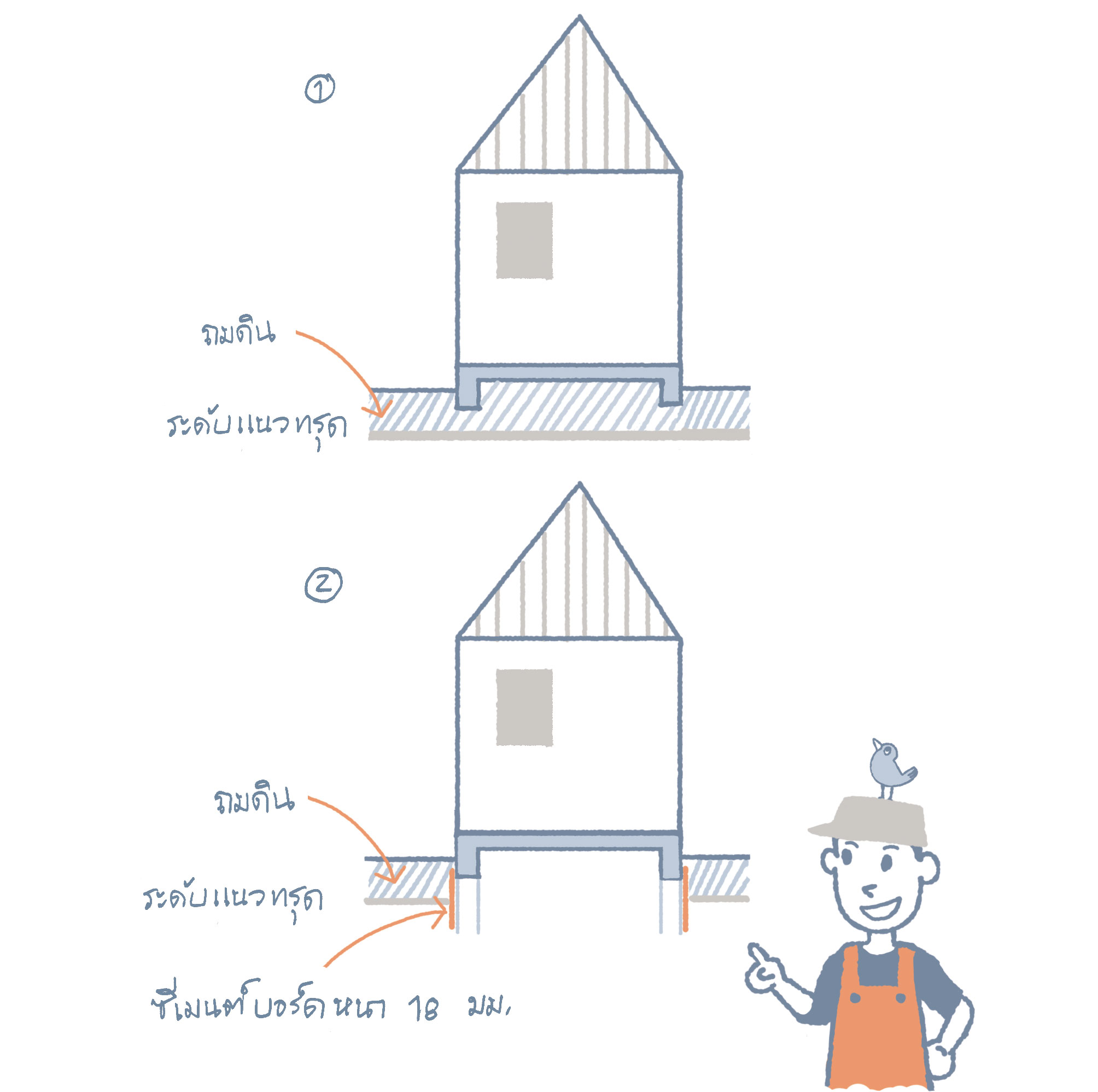 วิธีที่ 2 ถ้ากลัวว่าวิธีแรกจะทำให้เปลืองดินถมมากเกินไปให้ตัดแผ่นซีเมนต์ บอร์ดหนา 18 มิลลิเมตร ขนาดสูงกว่าช่องว่างใต้ตัวบ้านประมาณสองเท่า จากนั้นขุดดินเป็นร่องรอบบ้านแล้วฝังซีเมนต์บอร์ดลงไปในดินครึ่งหนึ่งของ ความสูงแผ่น โดยให้ขอบบนของแผ่นยันไว้กับขอบล่างของคานบ้าน วาง ซีเมนต์บอร์ดแผ่นต่อไปด้วยวิธีเดียวกันโดยให้ขอบซ้อนทับกับแผ่นก่อนหน้า อย่างน้อย 10-15 เซนติเมตรจนรอบตัวบ้านจากนั้นจึงถมดินสูงขึ้นมาจนถึง ระดับความสูงที่ต้องการเป็นอันเสร็จสิ้นกระบวนการ