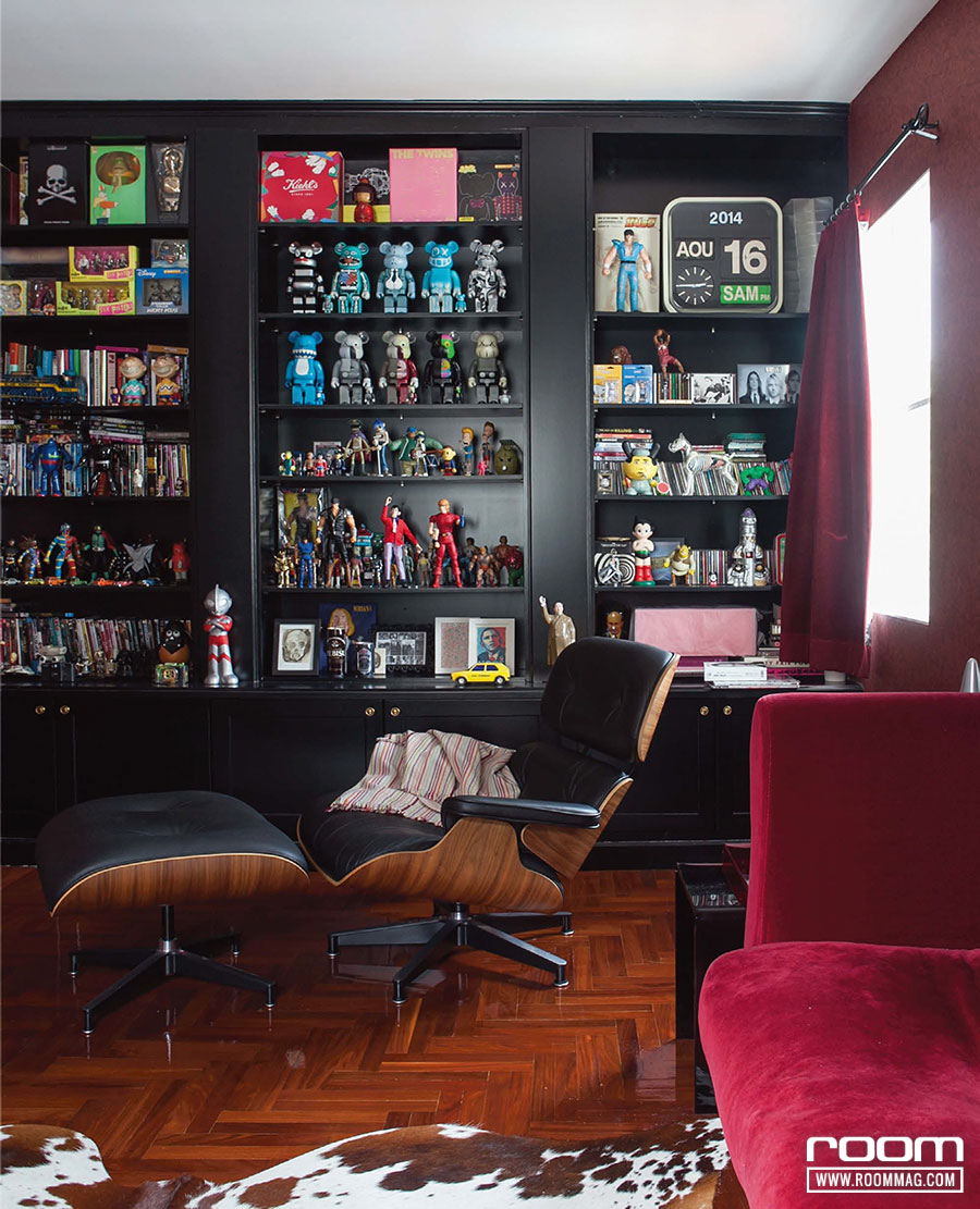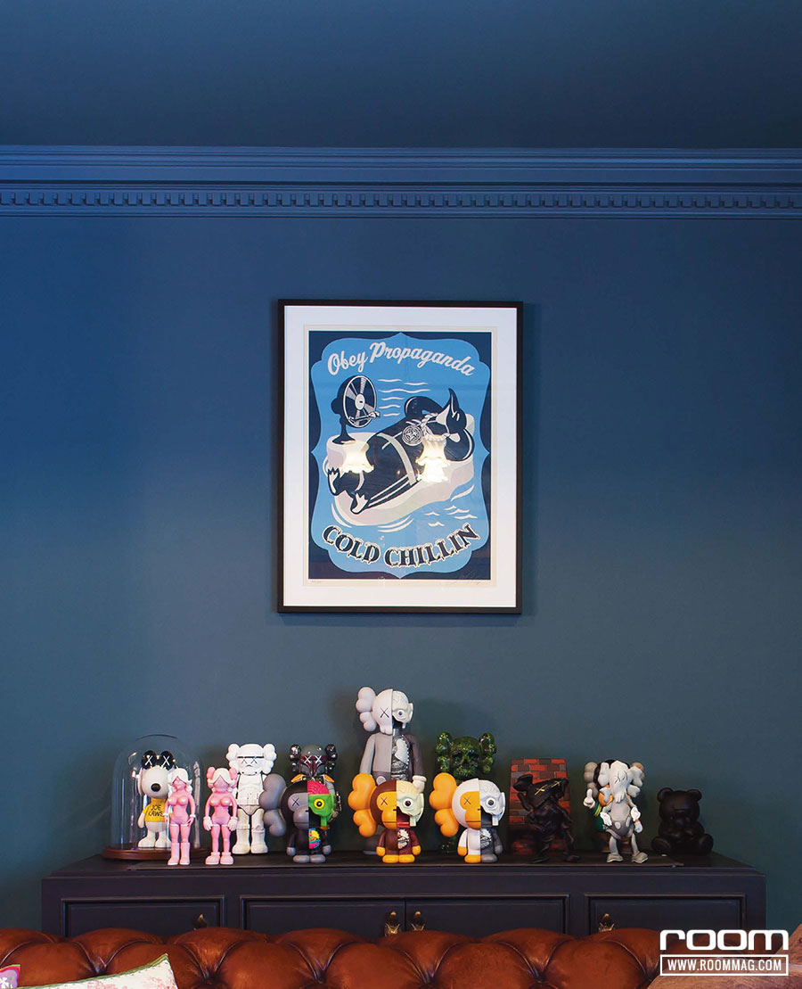 หลังจากได้รับโจทย์เรื่องการจัดวางของสะสม ดีไซเนอร์จึงขอดูของสะสมทั้งหมดและเลือกออกแบบให้บรรยากาศของบ้านออกมาดูอบอุ่น แฝงความสนุกสนาน ด้วยการใช้ผนังสีเทาเข้มกับเฟอร์นิเจอร์ชิ้นใหญ่โทนสีเข้ม แต่งเติมด้วยสีสันจากผลงานศิลปะและของสะสมต่าง ๆ เพื่อช่วย ดึงอารมณ์และสร้างความสดใสให้แก่บ้าน