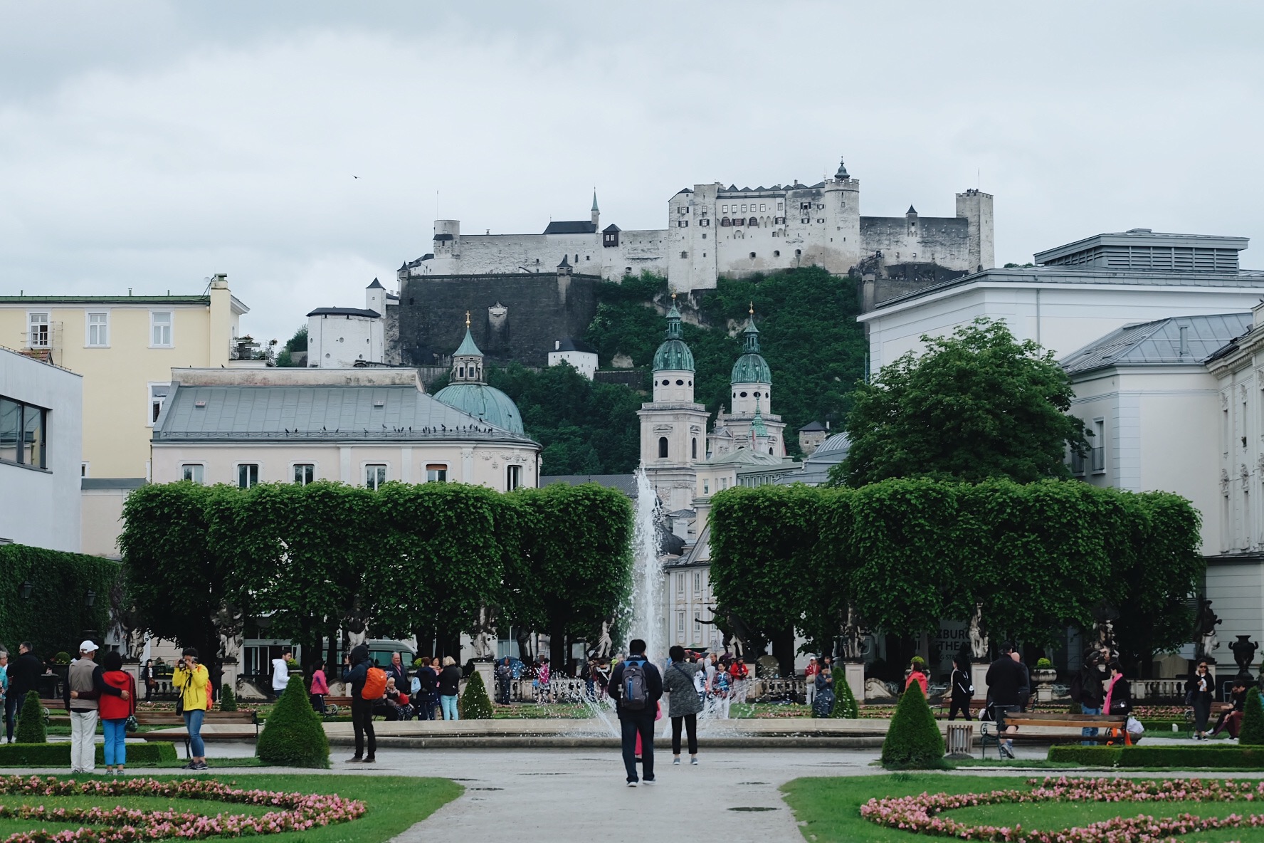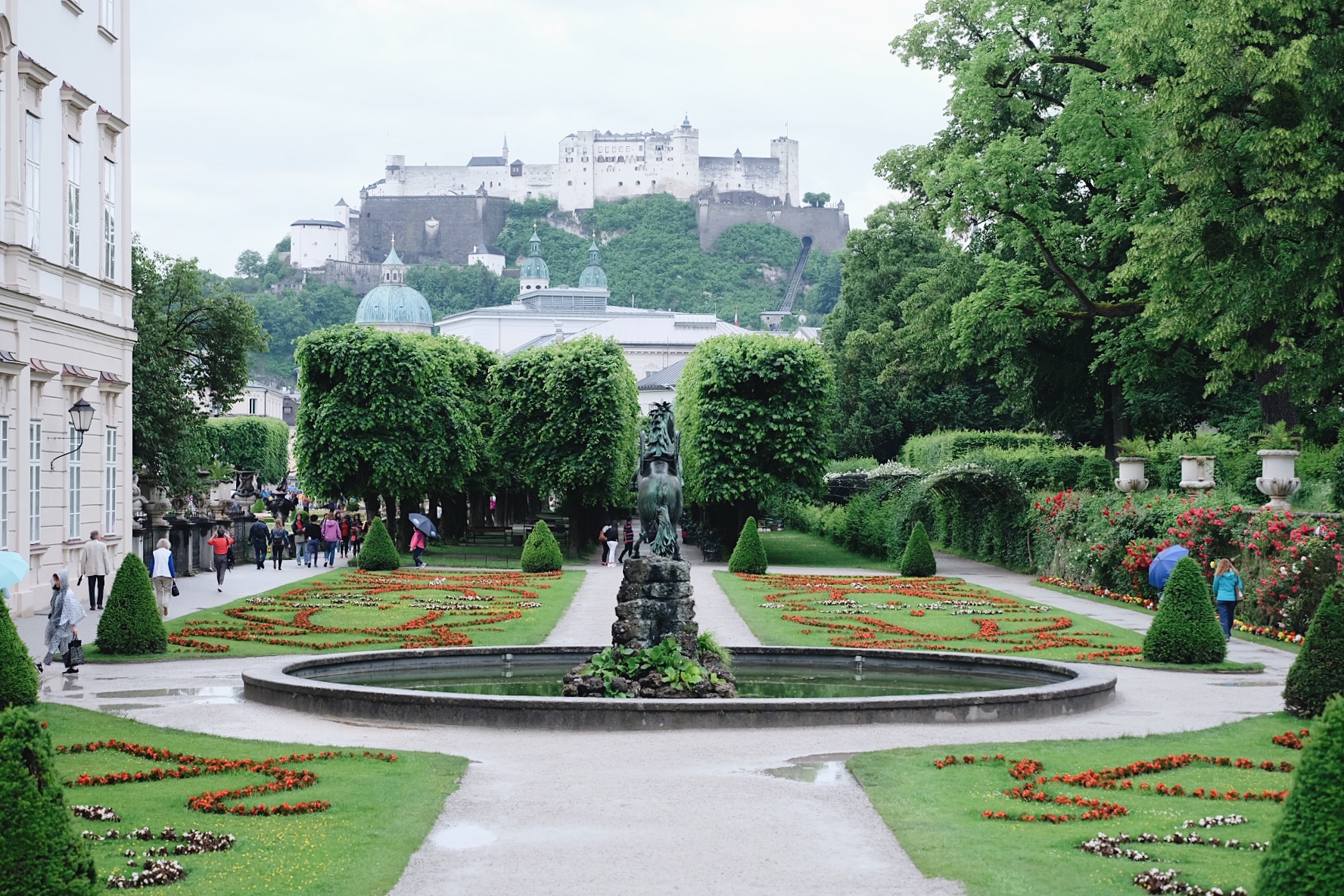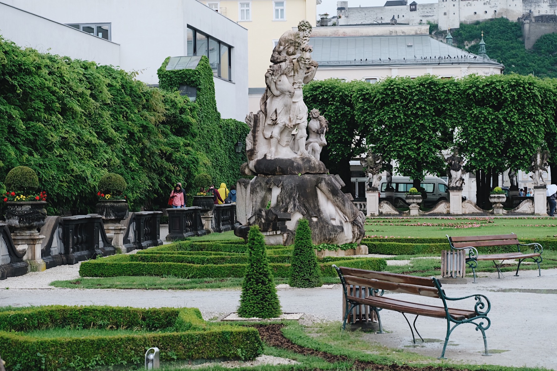 และเมื่อมองไปยังฝั่งเมืองเก่า จะเห็นฉากหลังเป็นยอดวิหารและป้อมปราการ Hohensalzburg บนยอดเขา ฉากหน้าสวยงามด้วยน้ำพุและขั้นบันไดในสวน ชวนให้นึกถึงฉากครูมาเรียกับเด็กๆ 7 คน กระโดดโลดเต้นอย่างร่าเริงในสวนกับบทเพลง De Re Mi ในภาพยนตร์เรื่อง The Sound Of Music ช่วยให้บรรยากาศของสวนแห่งนี้มีเรื่องราวที่น่าจดจำมากขึ้น