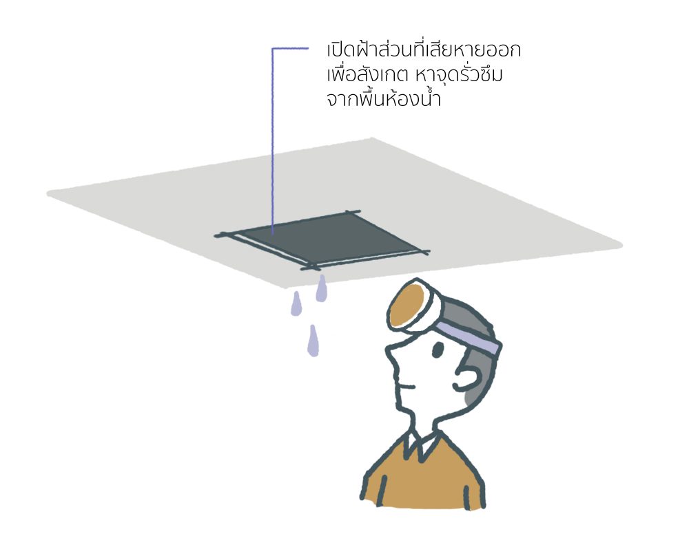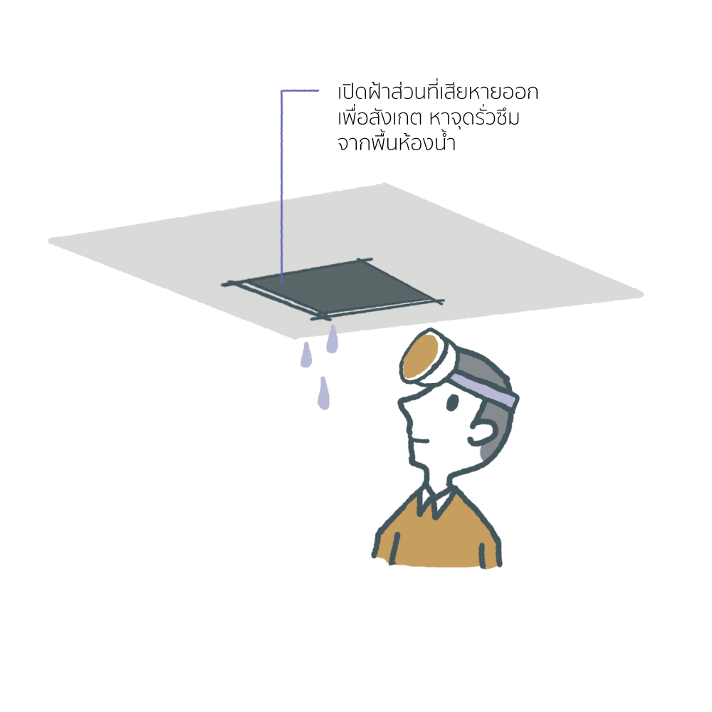 น้ำรั่วจากพื้นห้องน้ำชั้นบนลงมาทำให้ฝ้าเพดานชั้นล่างเสียหาย แก้ไขอย่างไร