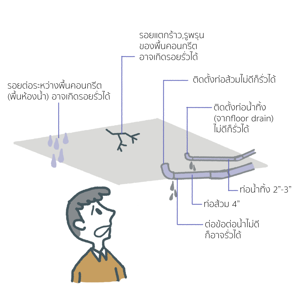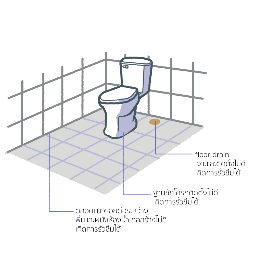 นอกจากนี้ที่พบบ่อยก็คือน้ำรั่วจากการติดตั้งชักโครกไม่ดี, รั่วจากการติดตั้ง FLOOR DRAIN หรือรูระบายน้ำที่พื้นและข้อต่อท่อระบายน้ำไม่สนิท