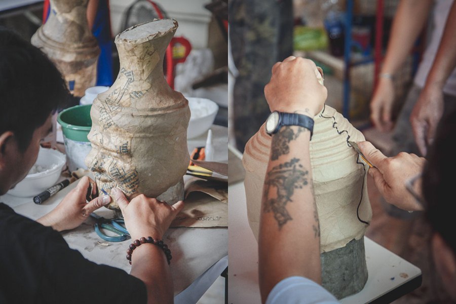 - ปิดหุ่น เป็นงานเปเปอร์มาเช่ โดยนำกระดาษมาทาแป้งเปียกปิดบนหุ่นซีเมนต์