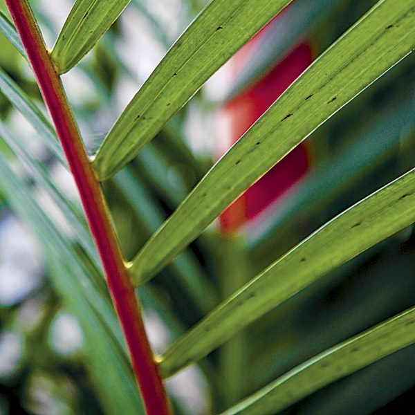 หมากแดง ปาล์มชนิดนี้ขึ้นเป็นกอ สูง 5-10 เมตรลำต้นสีเขียวปนแดงเห็นข้อชัดเจน มีกาบใบสีแดงอมส้มสะดุดตามาก เป็นไม้พื้นเมืองพบขึ้นในป่าพรุภาคใต้ ใช้เป็นไม้จัดสวนที่นิยมกันมากมานาน ใบประกอบรูปขนนก ด้านบนสีเขียวเข้ม ด้านล่างสีนวล ช่อใบห้อยย้อย ผลิดอกเป็นช่อต่ำกว่ากาบใบ ยาวประมาณ 50-70 เซนติเมตร ผลสุกสีแดงคล้ำถึงดำทรงรียาวประมาณ 1 เซนติเมตร ปลูกในดินชื้นรดน้ำสม่ำเสมอ หรือในที่เฉอะแฉะริมน้ำก็จะตรงกับความชอบของปาล์มชนิดนี้