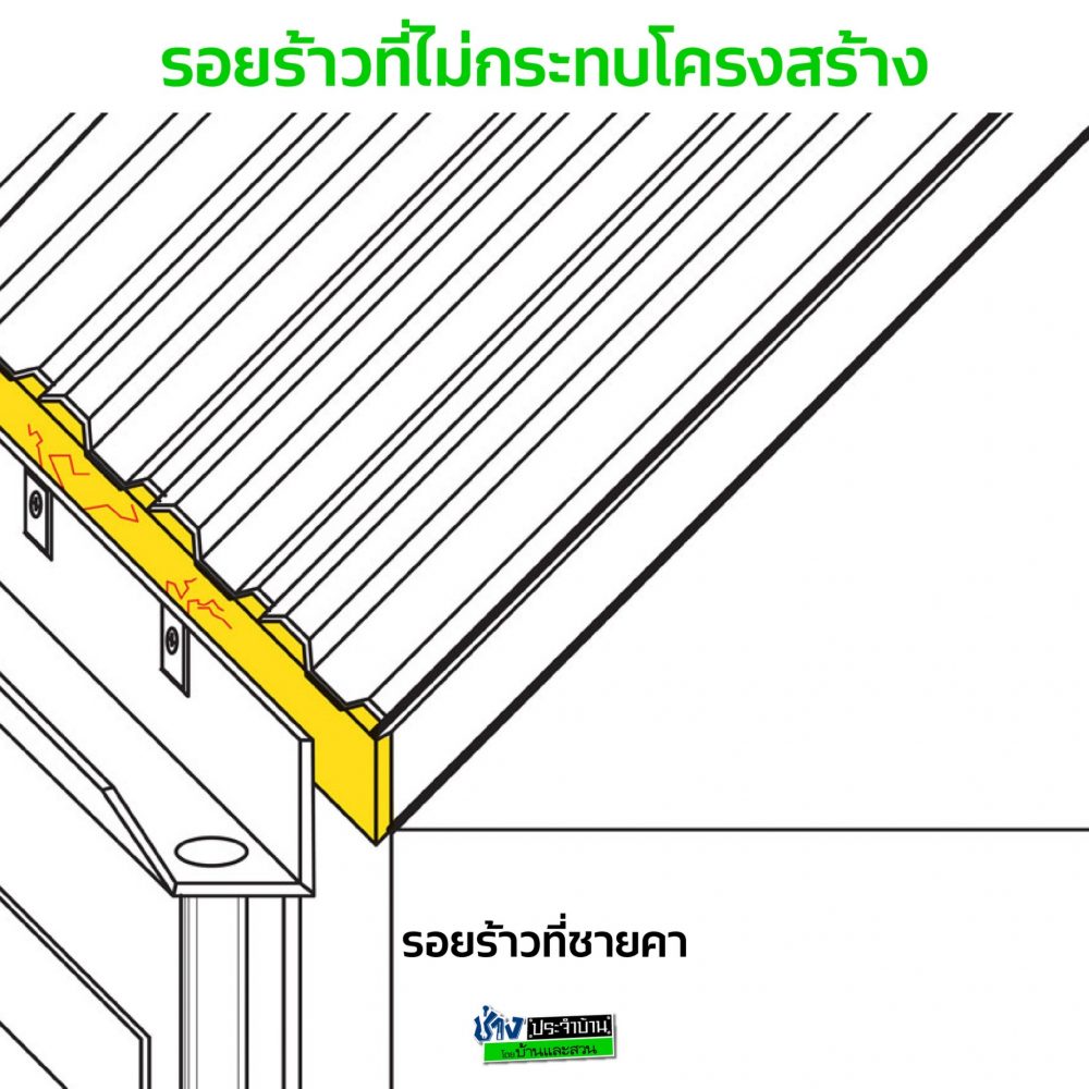 สาเหตุ – เกิดจากการที่รางน้ำฝนรับน้ำหนักมากเกินไปจนรั้งน้ำหนักลงที่ชายคา ทำให้เกิดการแตกร้าว